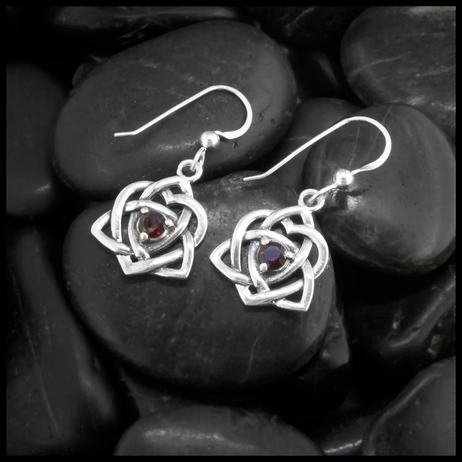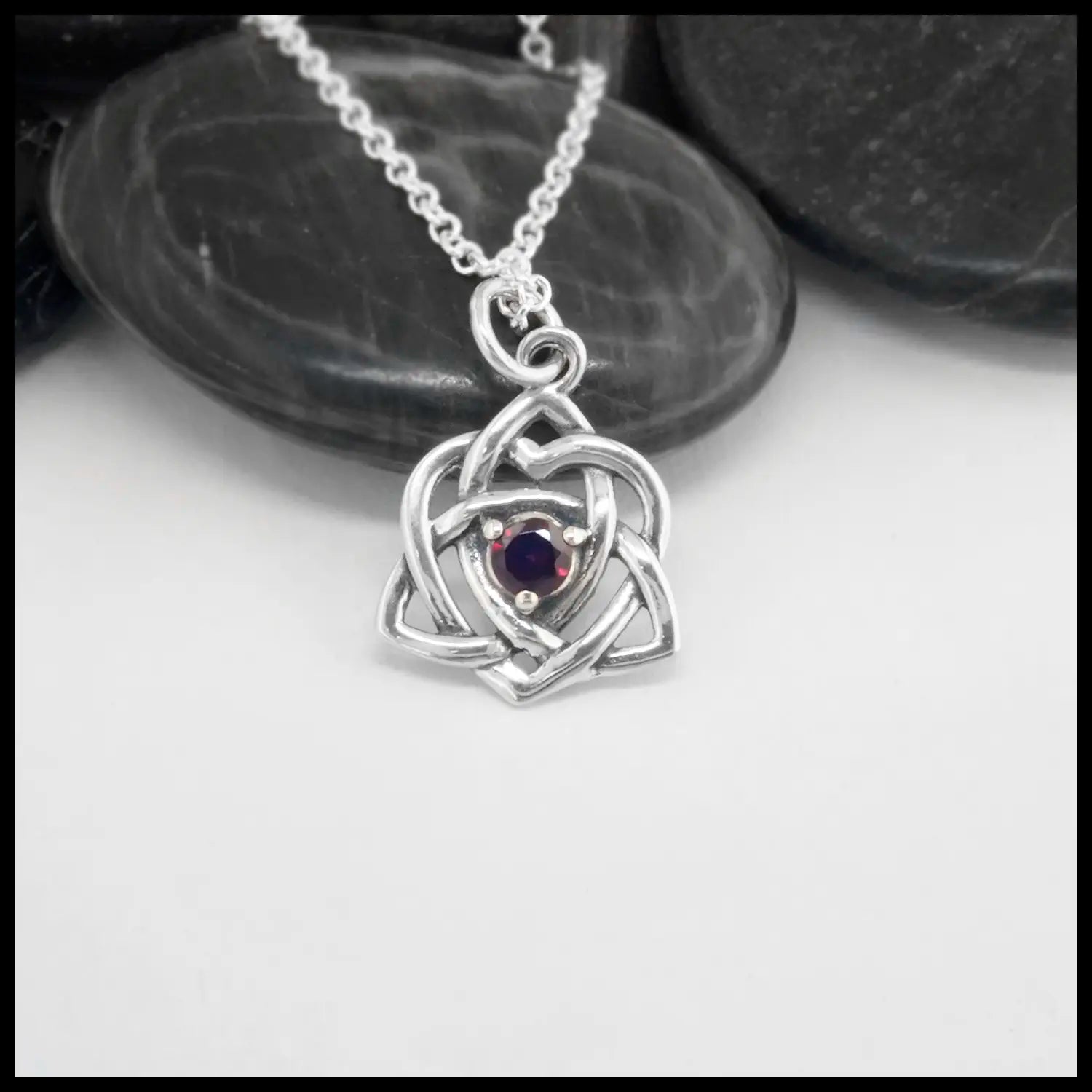 This lovely Limited Edition Set combines the Trinity Knot Heart drop earrings with its matching Pendant in Sterling Silver, both set with 4mm Rhodolite Garnets. This set includes 18" Cable Chain.