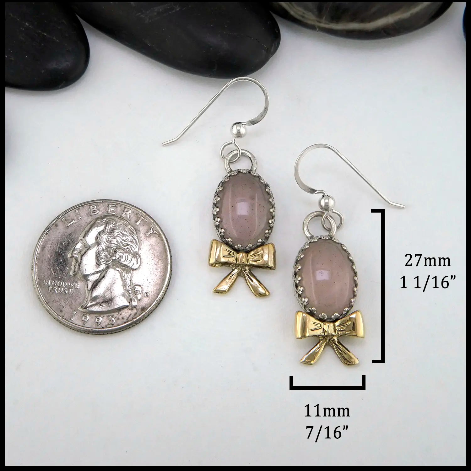 Set in Sterling Silver, these Rose Quartz Drop Earrings are one of a kind! With 18K Yellow Gold Bow details, these earrings make the perfect gift. Created by our craftsman Terry, only one pair is available.