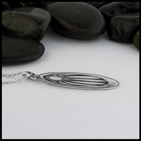 This sterling silver pendant depicts a flying dove from above. A heart is hidden in...
