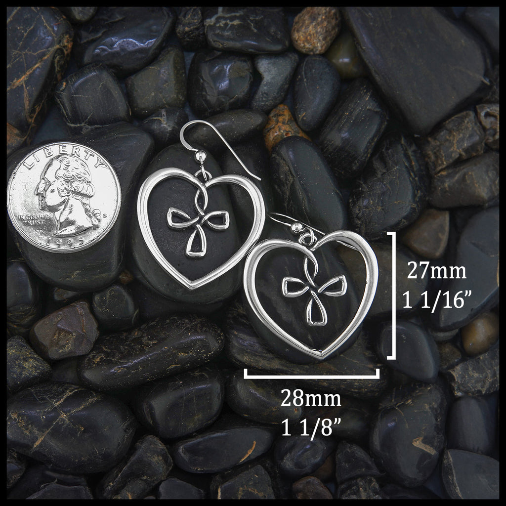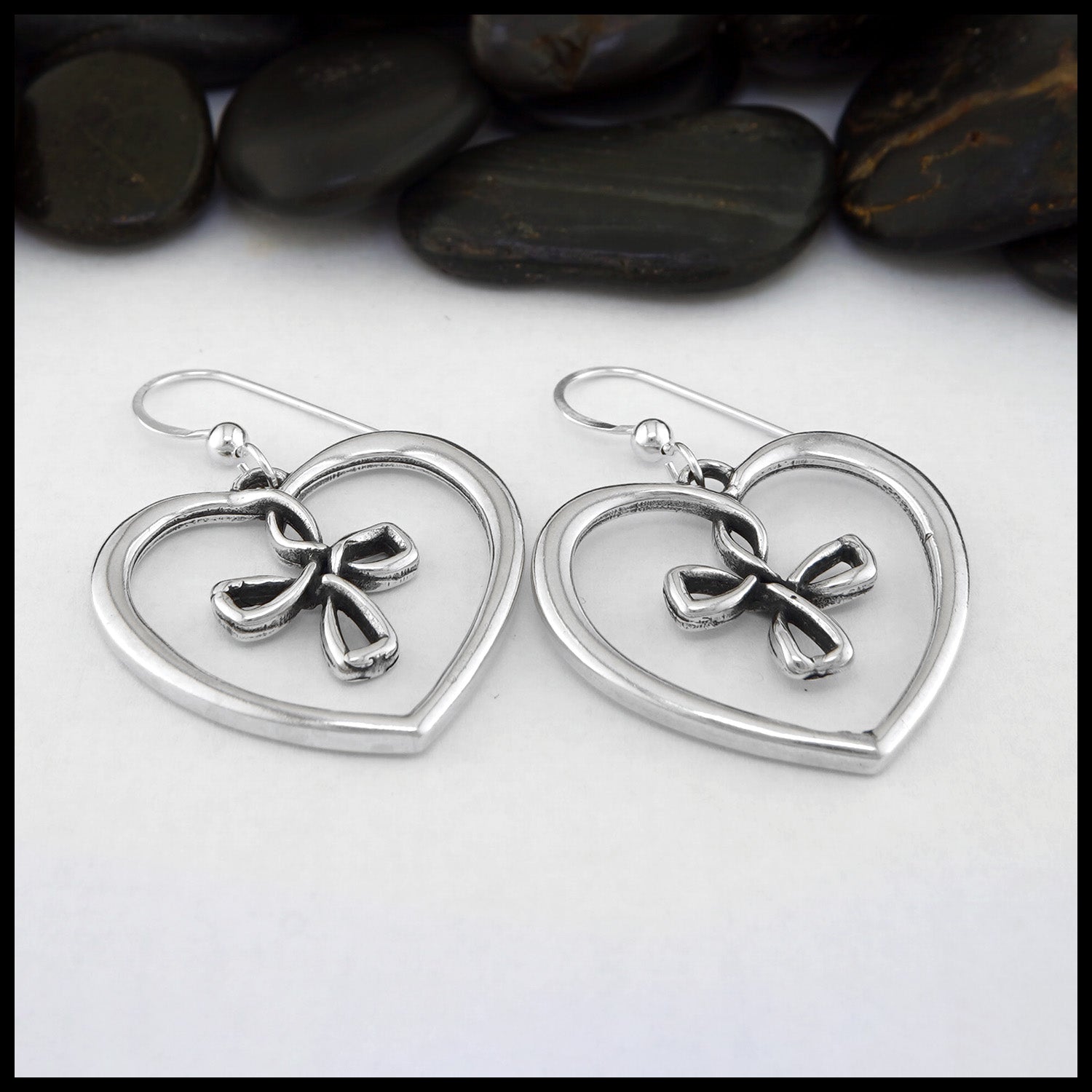 These sterling silver drop earrings are shaped in the form of a heart with a continuous frame twisting to create an open knot cross in the center of the heart.