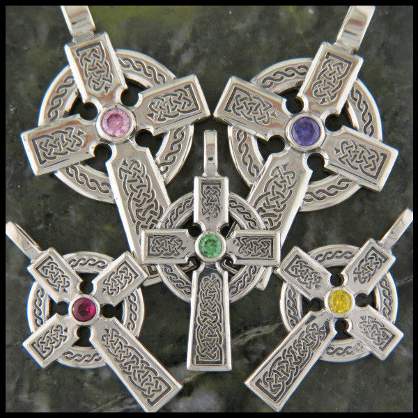 Sterling Silver Celtic Cross set with a Green Cubic Zirconium or your choice of other simulated birthstones. Made in the USA by Walker Metalsmiths. Available with an adjustable cord or on a Medium Rolo Chain.