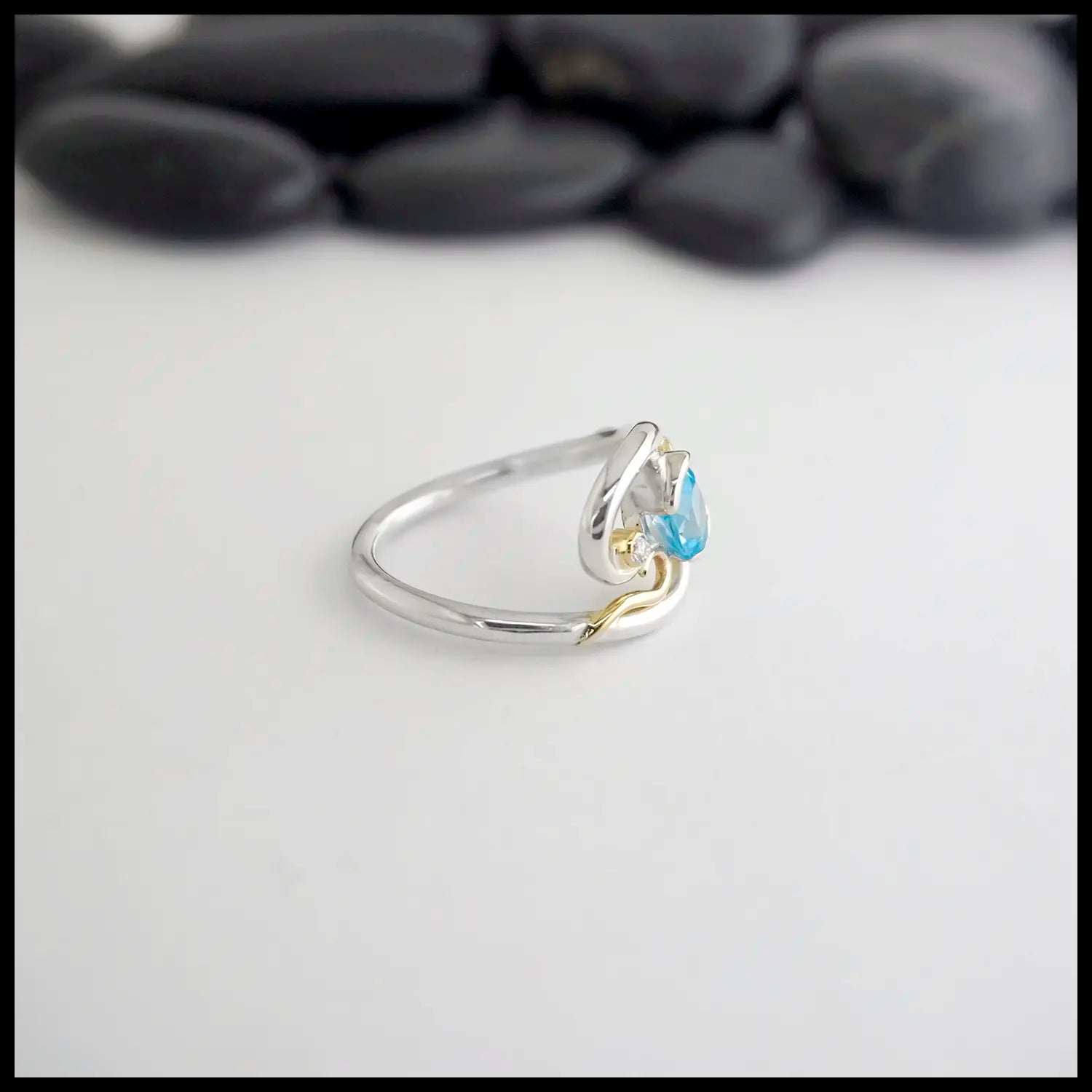 This ring showcases a Blue Topaz set in a custom Sterling Silver band. The band is decorated with a Diamond bezel set in 14K Yellow Gold along with 14K Yellow Gold Flourishes. This ring is a size 6 1/4 and can be resized upon request.