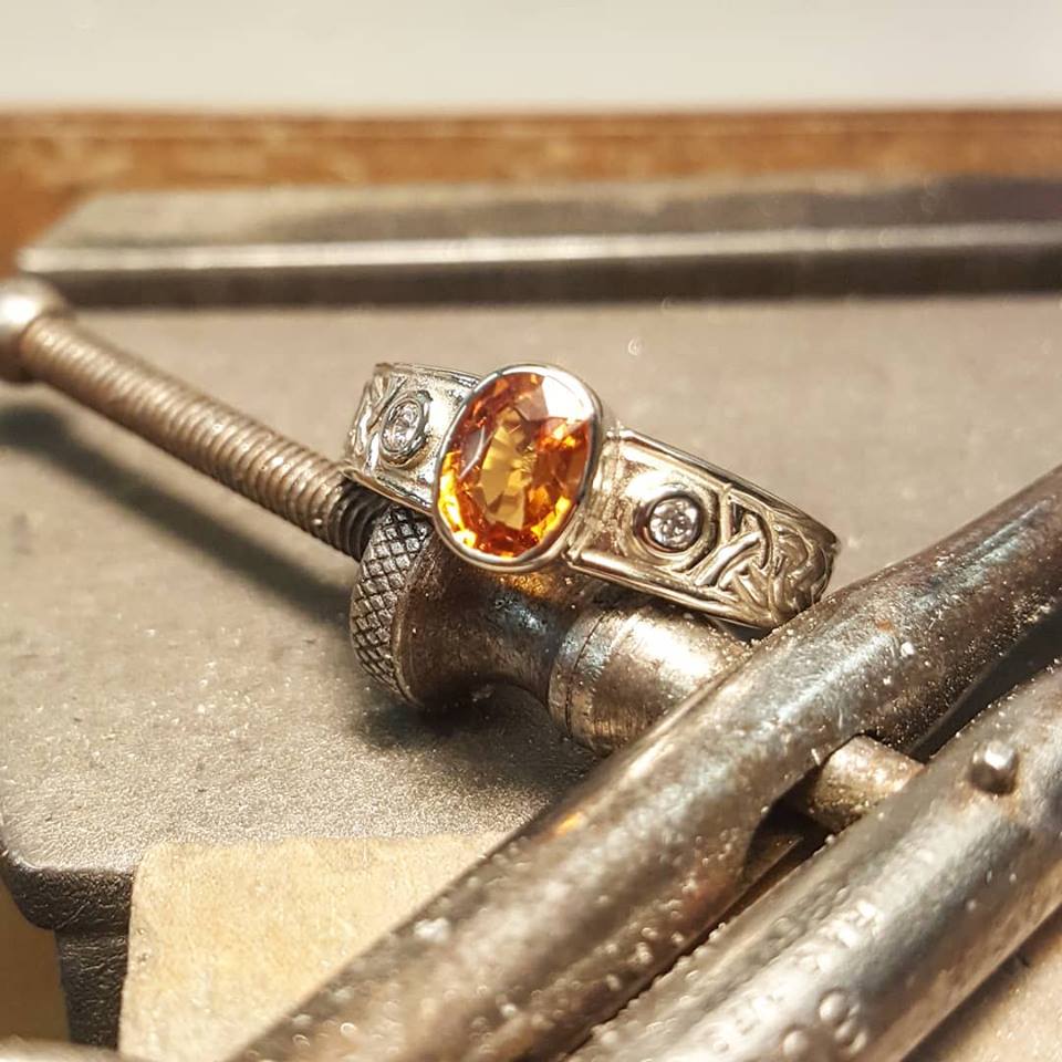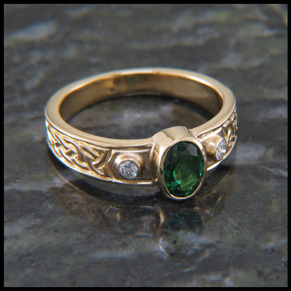 This three stone Celtic knot ring is set with an oval center 7 x 5 mm stone of Amethyst, Garnet, Evergreen Topaz, or Tsavorite with a diamond on either side. The Celtic knotwork continues around the band and is available in 14K Yellow, Rose, or White Gold.