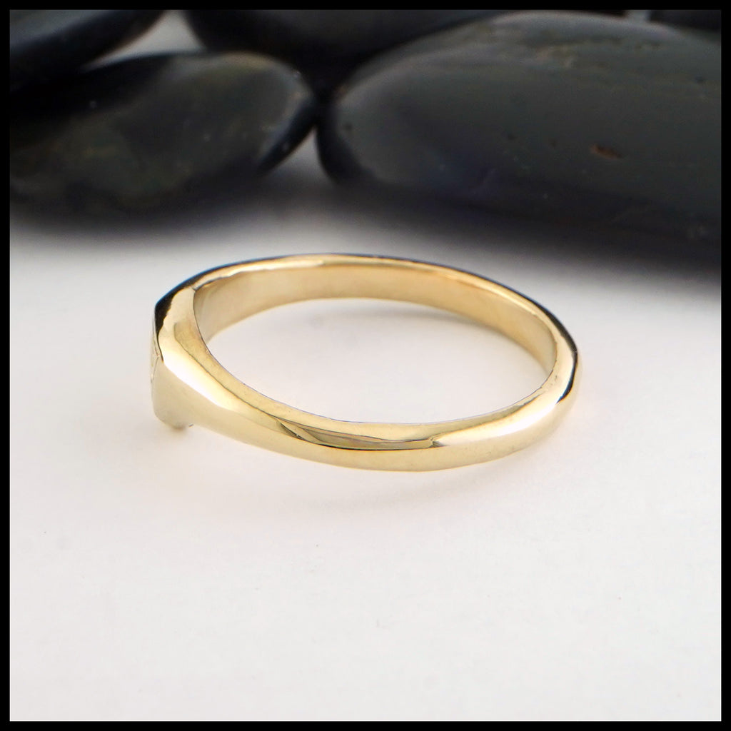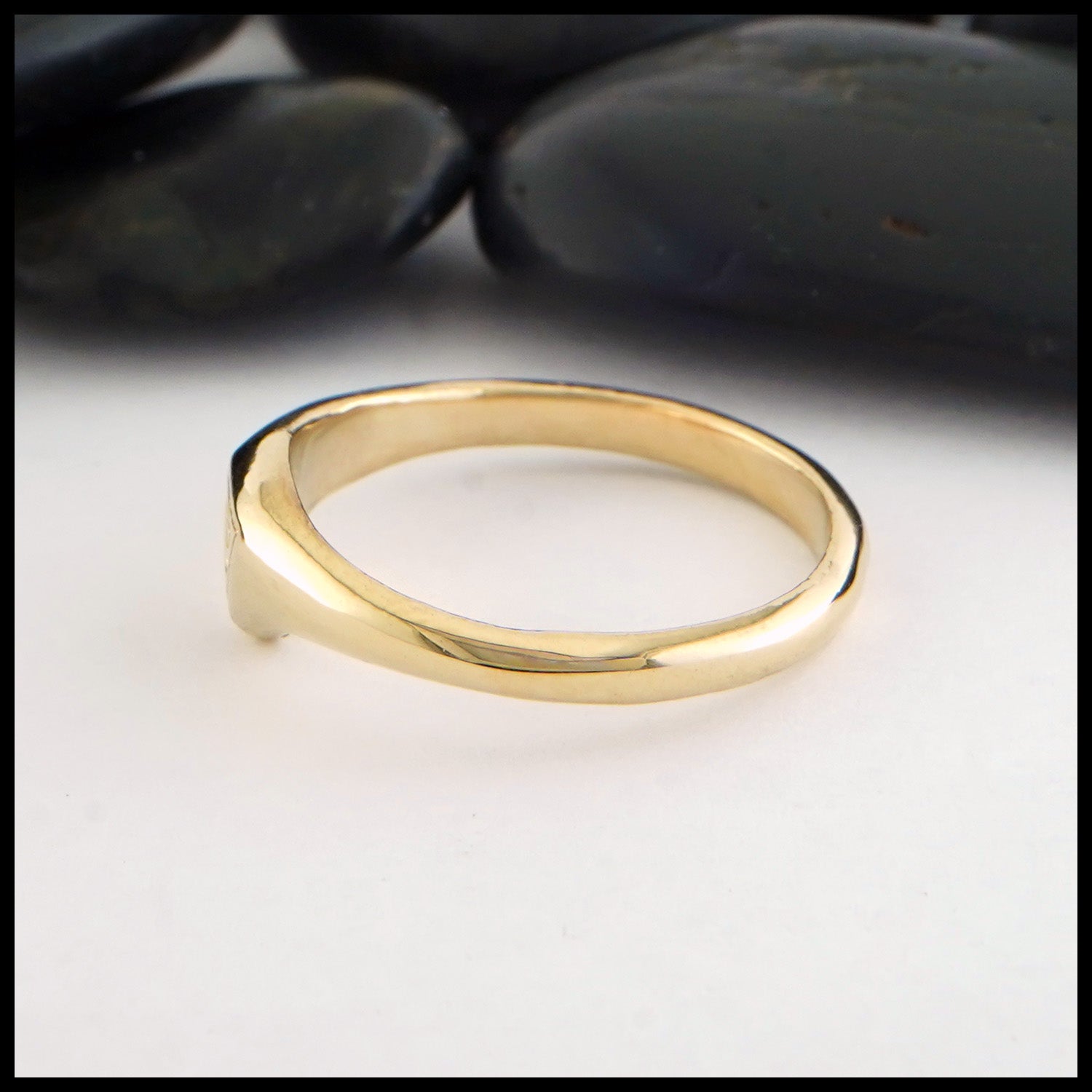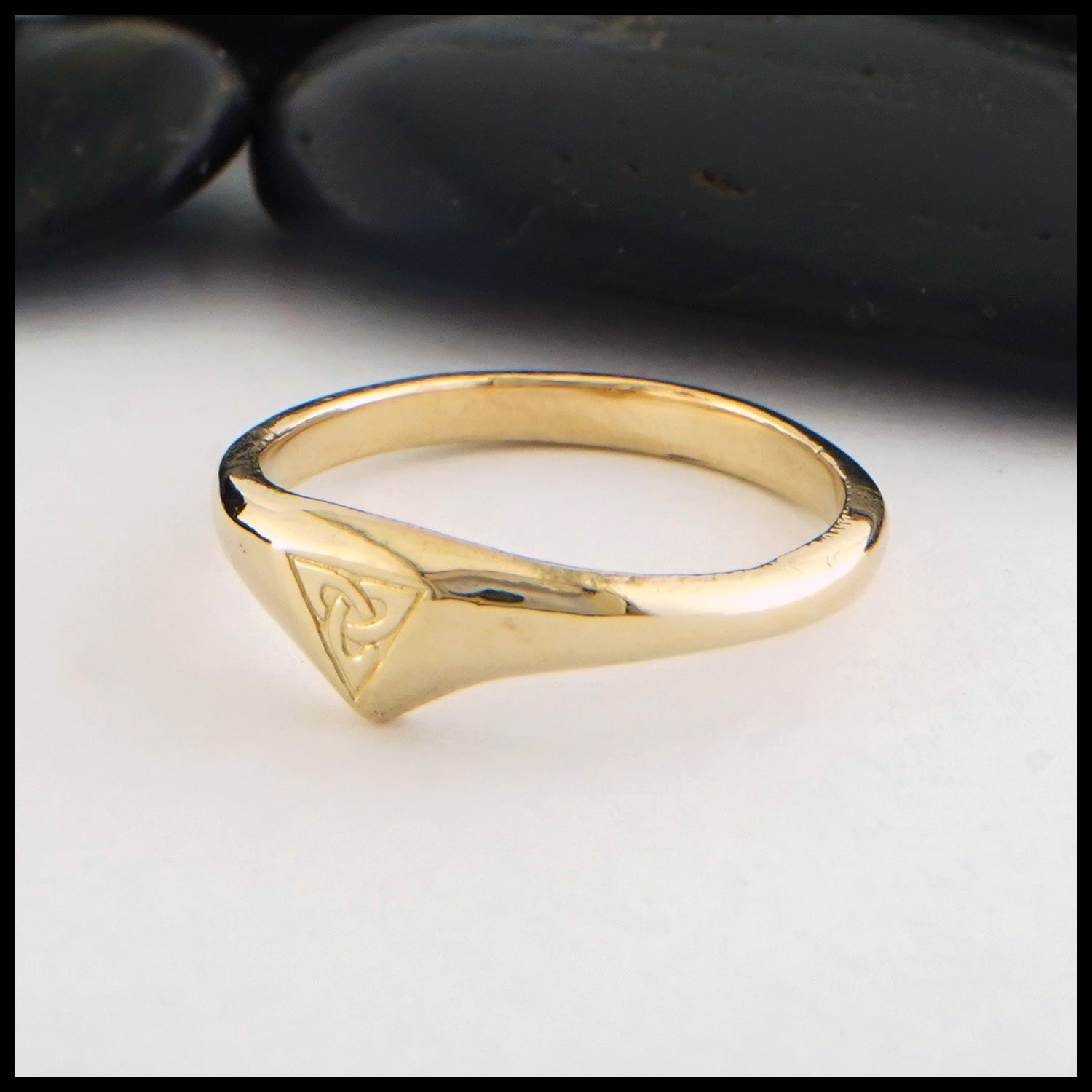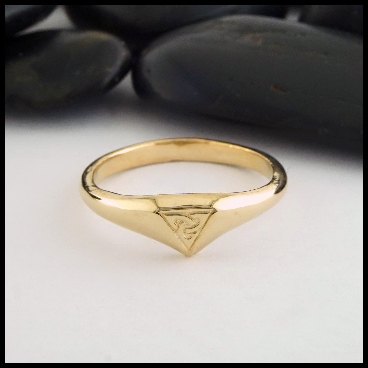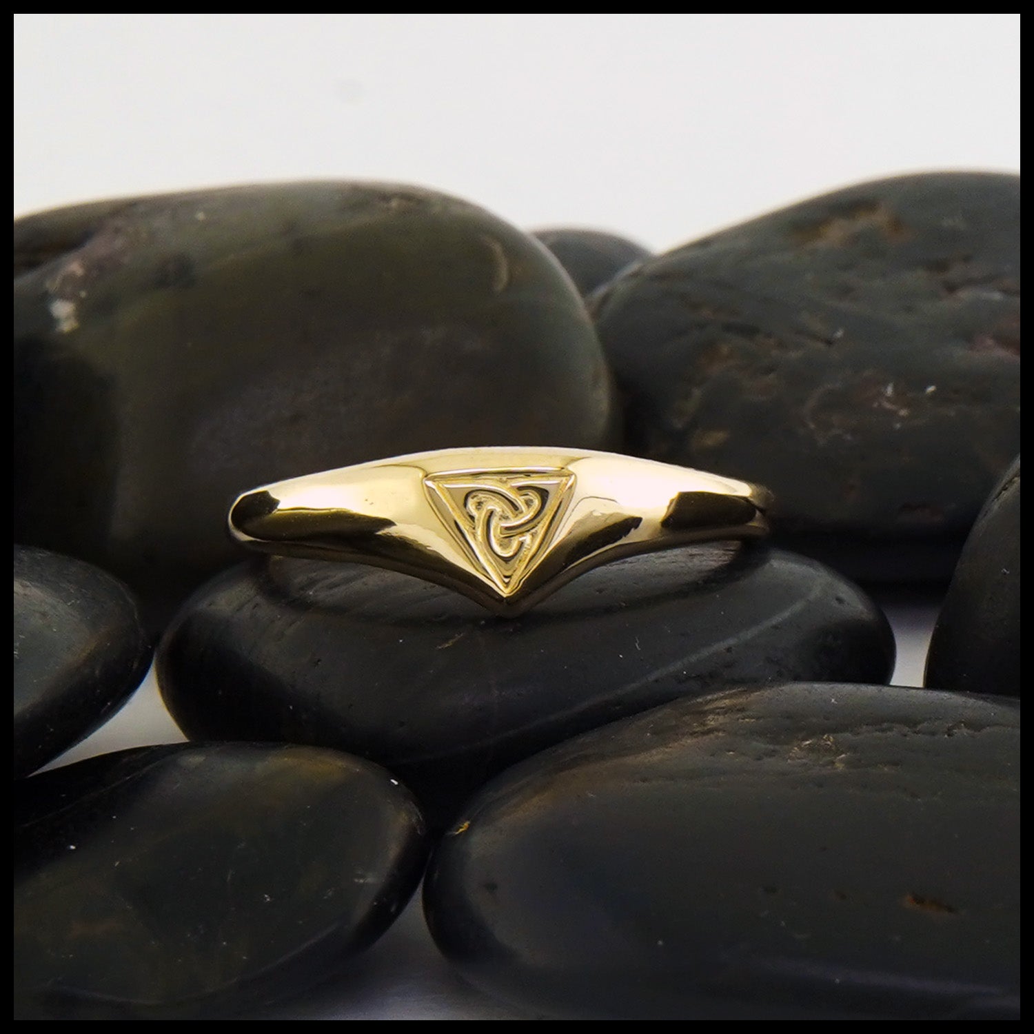 Gold ring with a small Trinity Knot design. This ring comes in your choice of 14k yellow, rose, or white gold. The featured ring is a size 7 1/4.