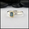 A rose-cut blue-green tourmaline sits in an 18K yellow gold bezel on a hand-fabricated sterling silver band. The rustic texture of the silver is intentional, giving the ring an organic, artisan quality that pairs naturally with the tourmaline's own character. Rose-cut stones show their color through a faceted dome rather than deep brilliance, and each tourmaline in this series is unique: many are asymmetrical and show natural inclusions that make them one of a kind. Can be sized upon request.