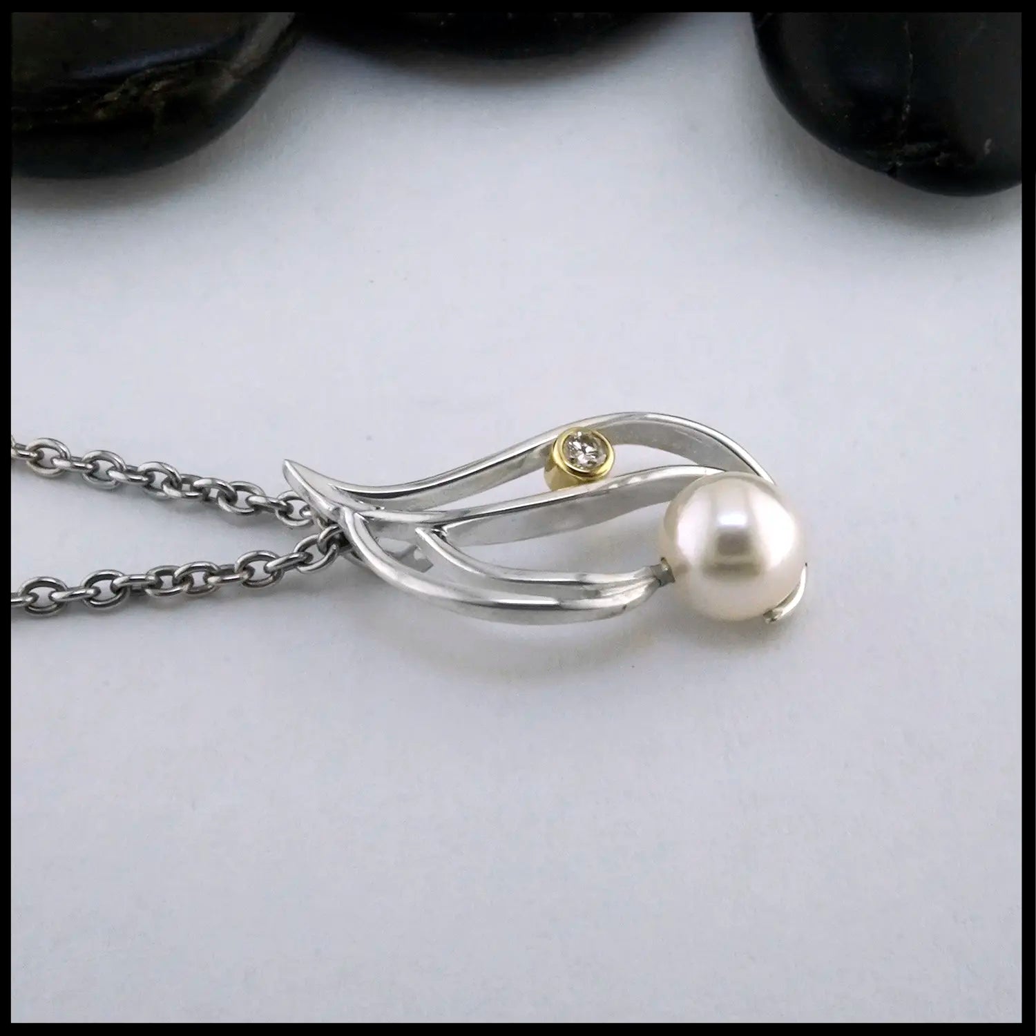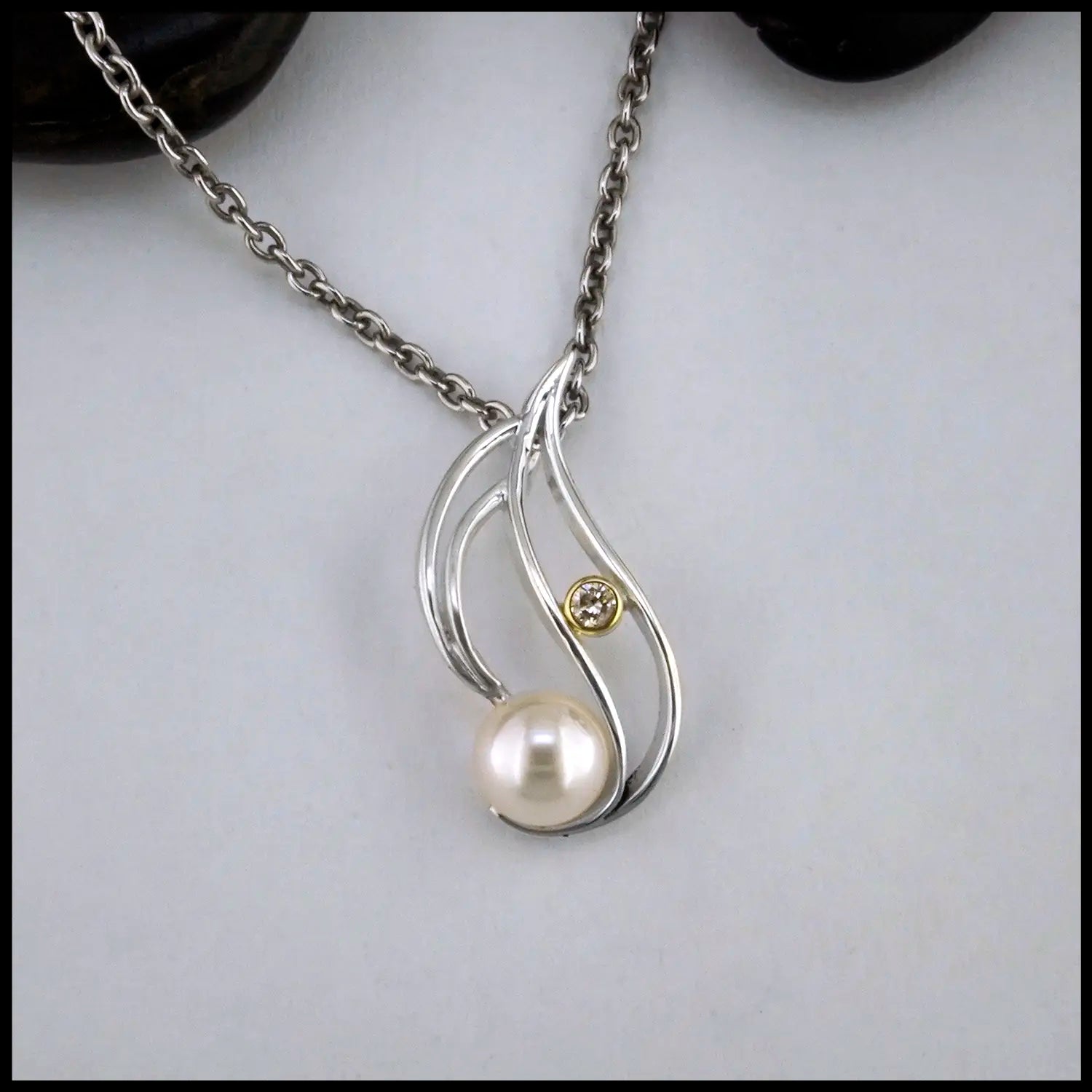 This unique pendant holds a Freshwater Pearl set in a flowing Sterling Silver frame. Accenting the Pearl is a 2mm Diamond, bezel set in 14K Yellow Gold. Created by craftsman Tom Carter, this pendant comes with an 18" cable chain.