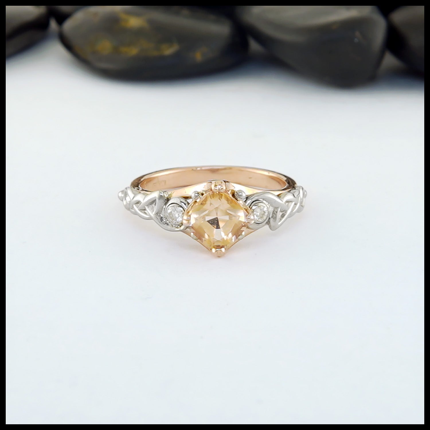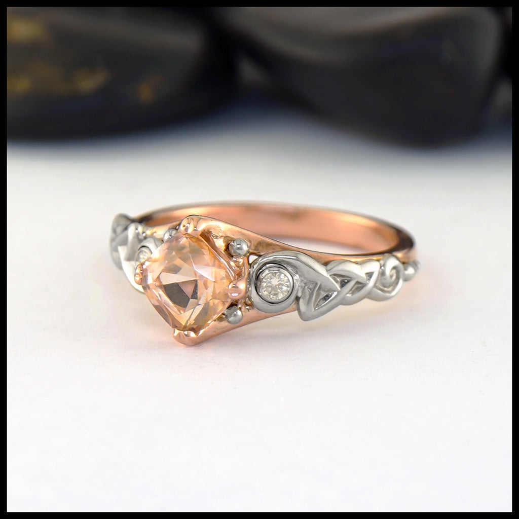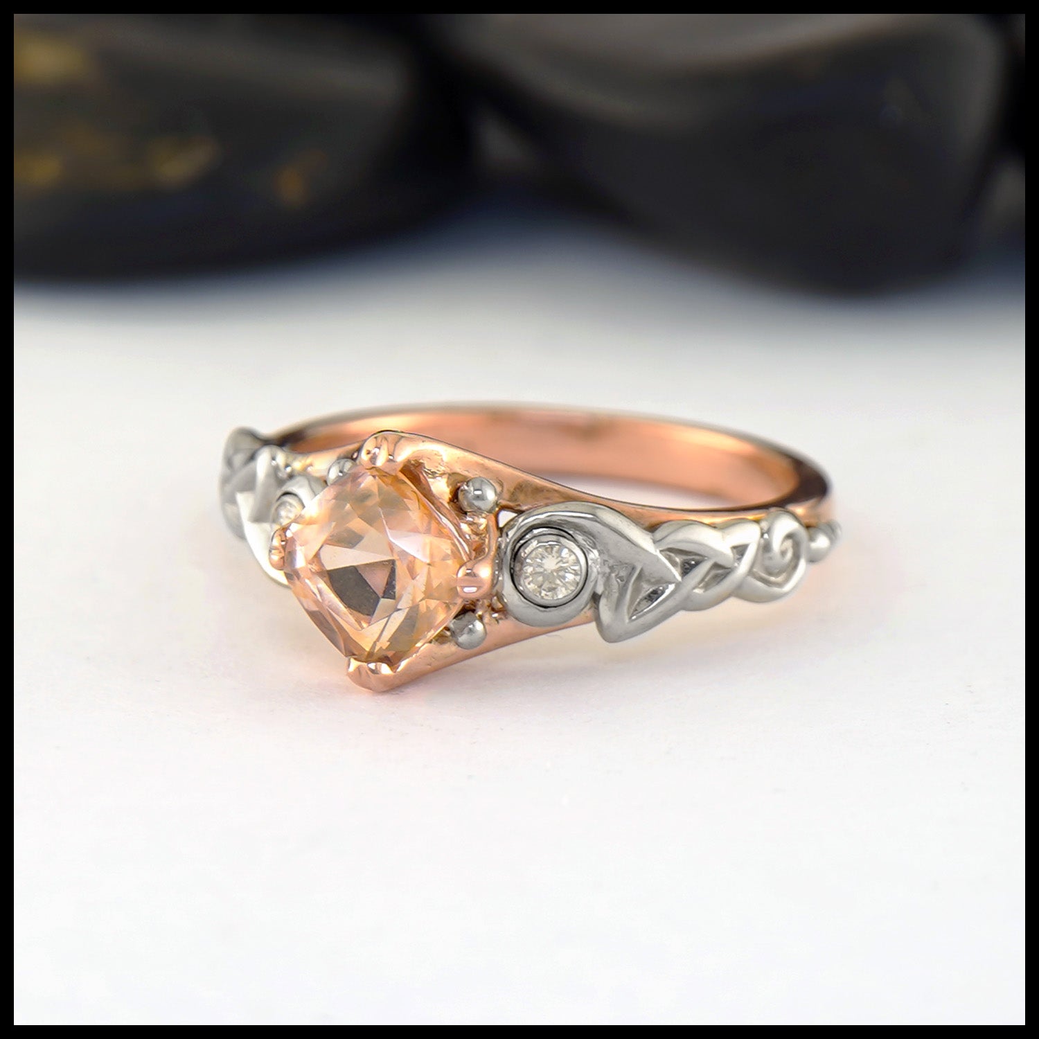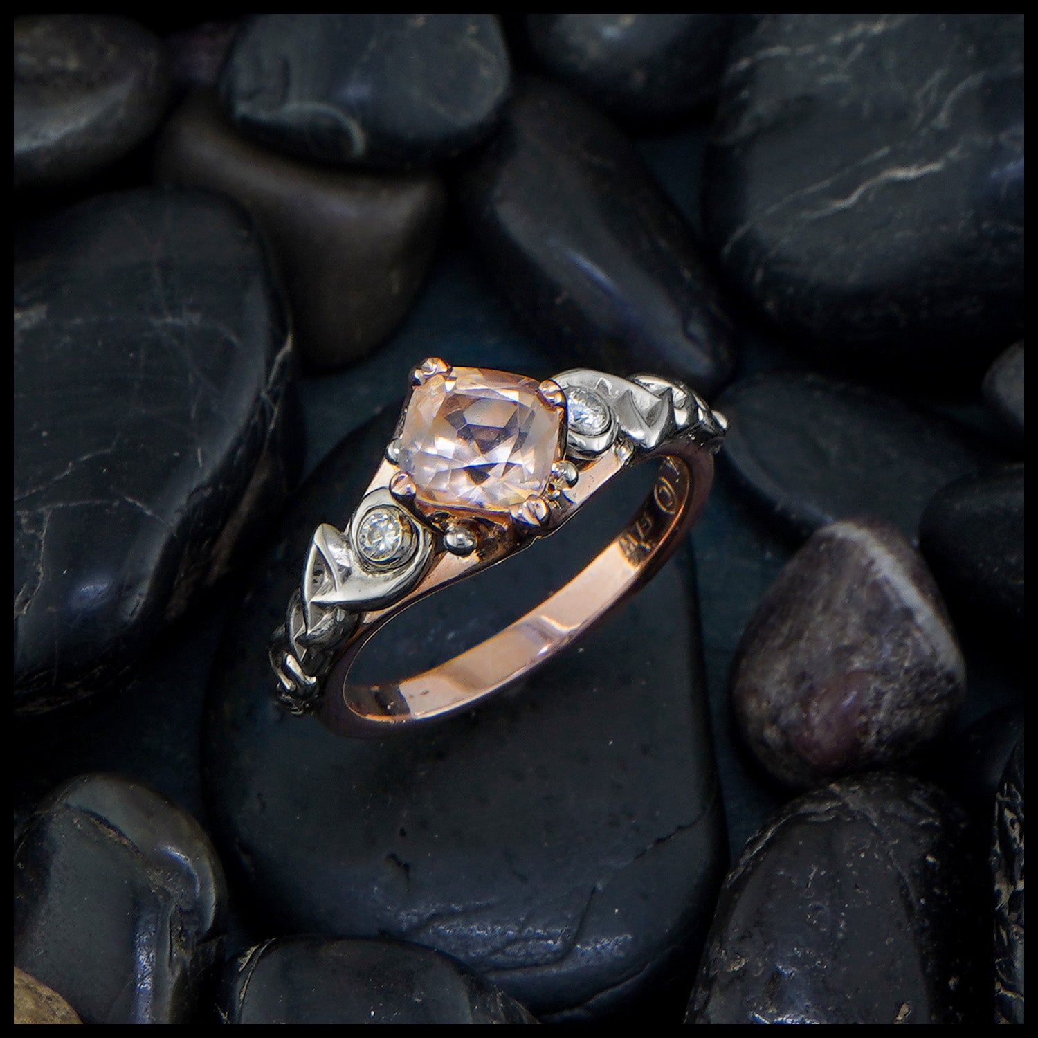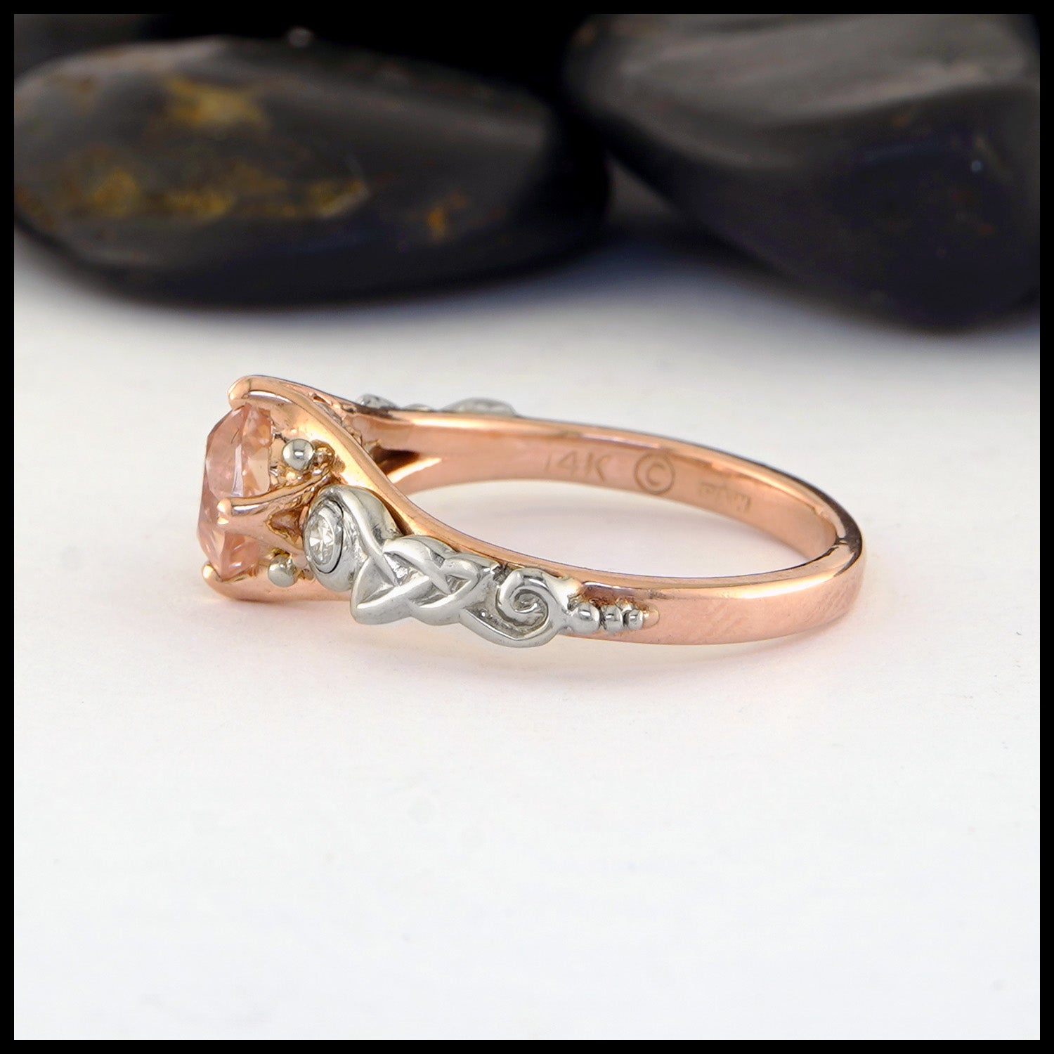 Custom 14K Rose and White gold ring, set with a 1.07ct cushion cut Morganite accented with two 2mm Diamonds. This ring is currently a size 7 1/2, but can be re-sized upon request.
