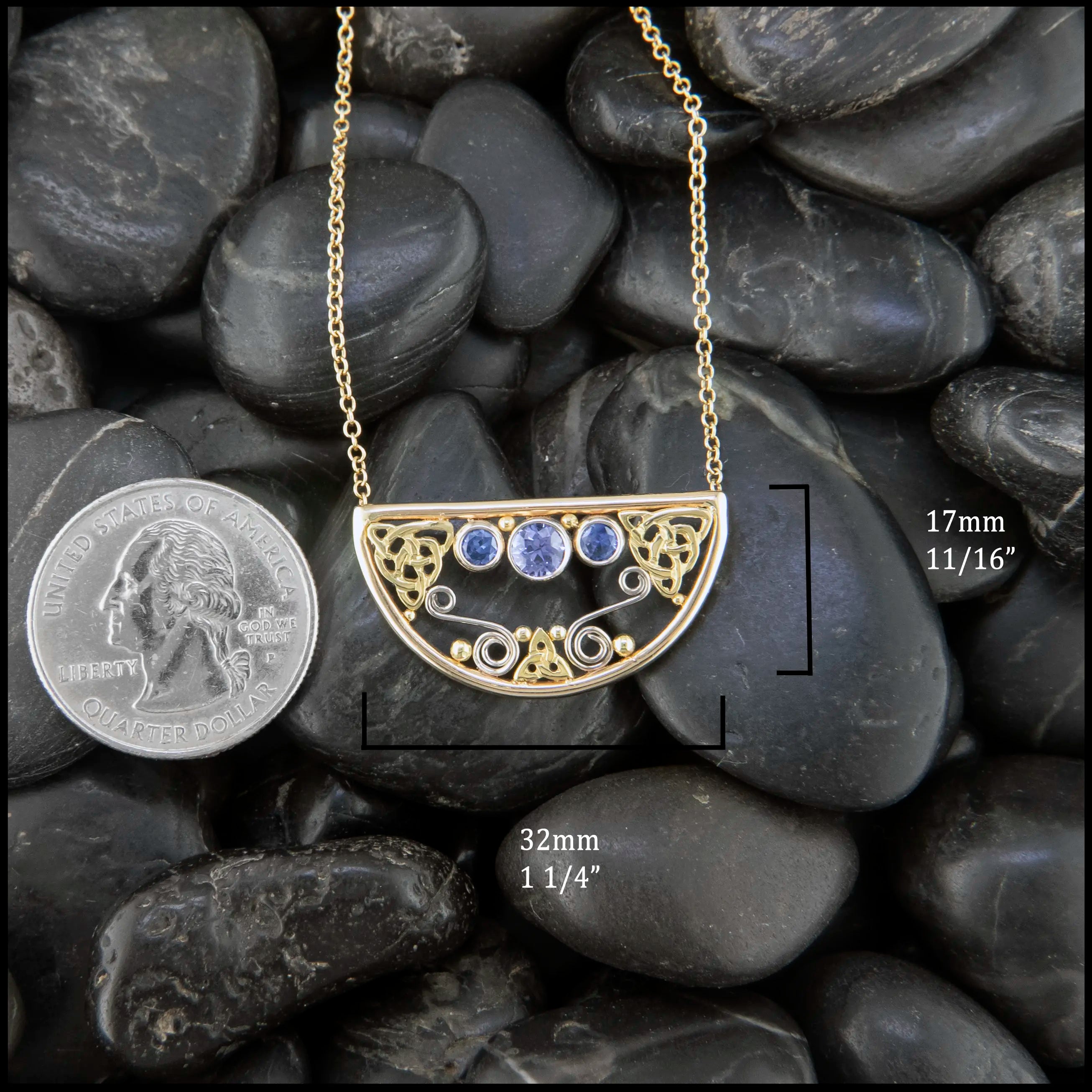 This gorgeous 14K Yellow Gold Crescent Frame Pendant displays three Ceylon Blue Sapphires, measuring at 5mm and 4mm. With 18K gold Trinity Knots and Beading, this frame also holds 14K White Gold Spiral details. On an attached 18" 14K gold light curb chain, this pendant rests at a total of 19 inches.