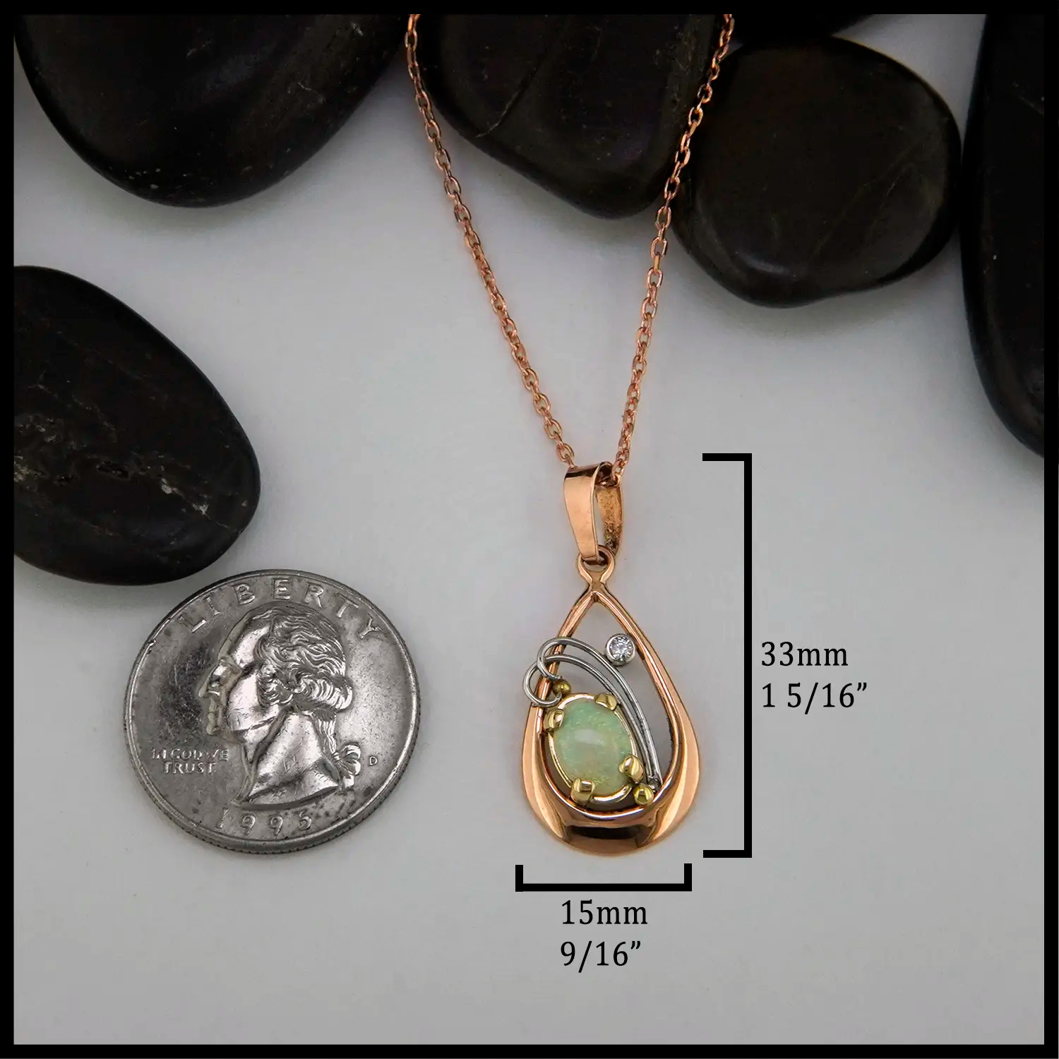 Set in a 14K Rose Gold Frame, this stunning 8x6mm Opal pendant is prong set in 14K Yellow gold. 14K White Gold spirals frame the stone setting, along with a 2mm diamond, set in a 14K White gold Bezel. Created by our craftsman Sydney, this pendant comes on an 18" Diamond Cut Cable chain in 14K Rose gold.