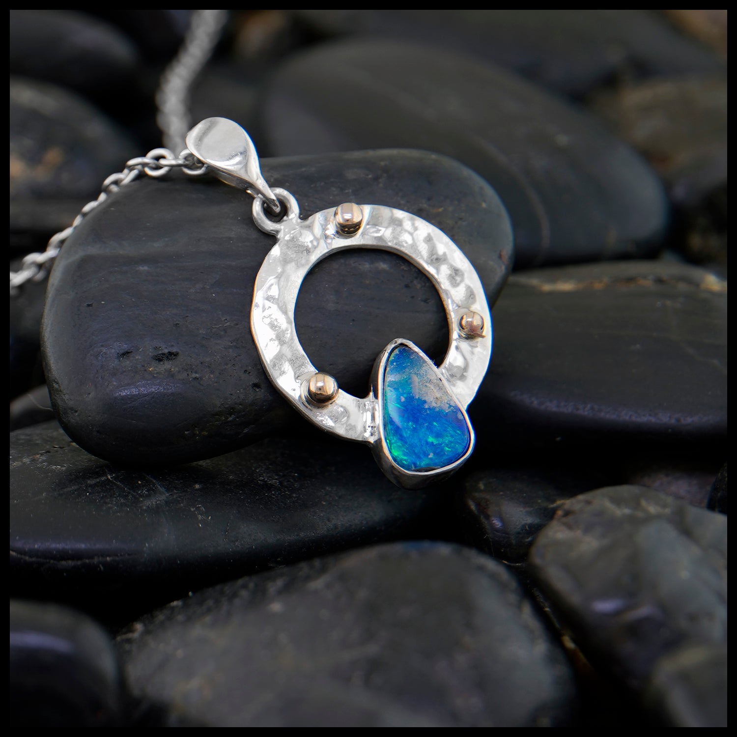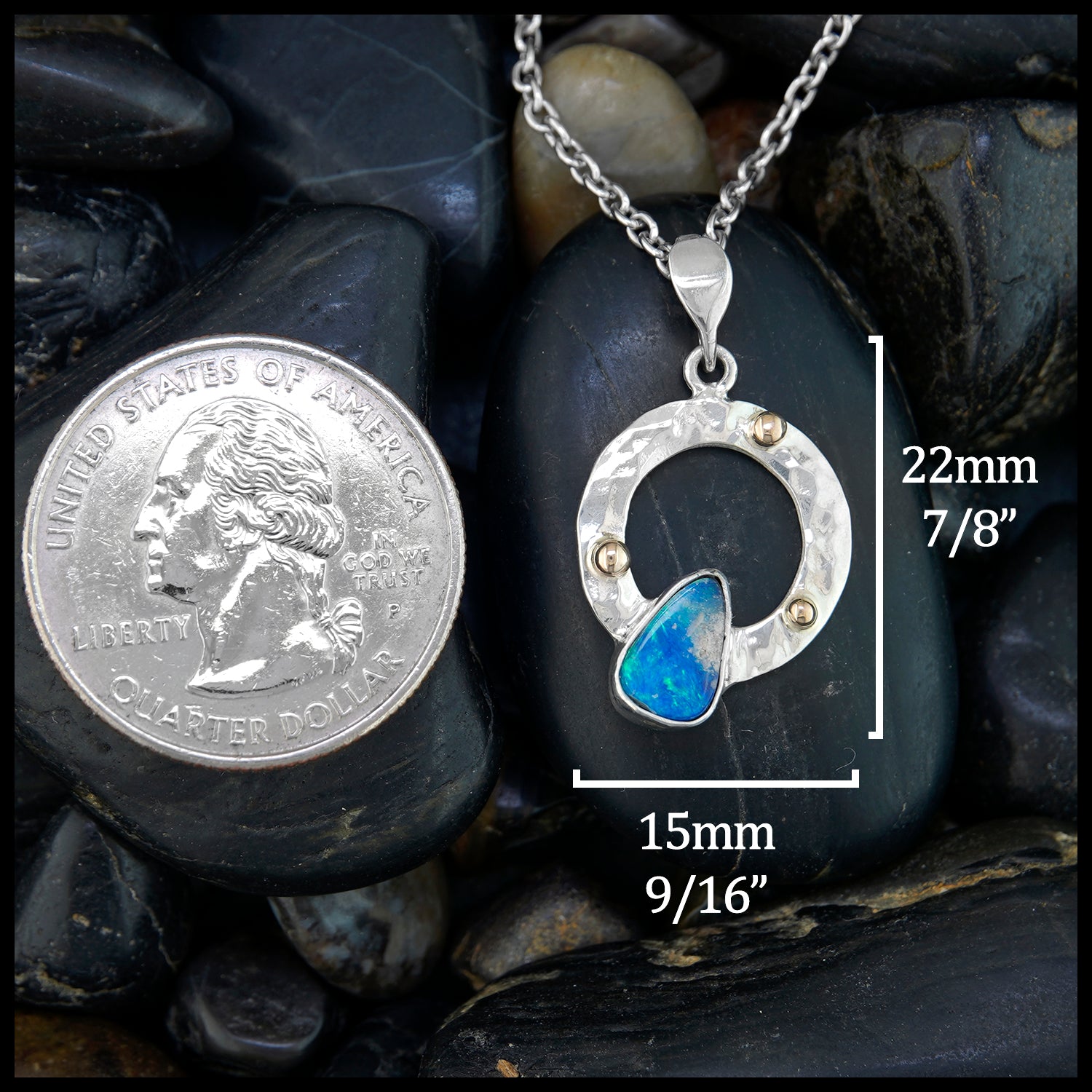 This hammered pendant is made from sterling silver and holds an opal doublet. The pendant is accented with 14K yellow gold beads. This pendant comes with an 18" cable chain.