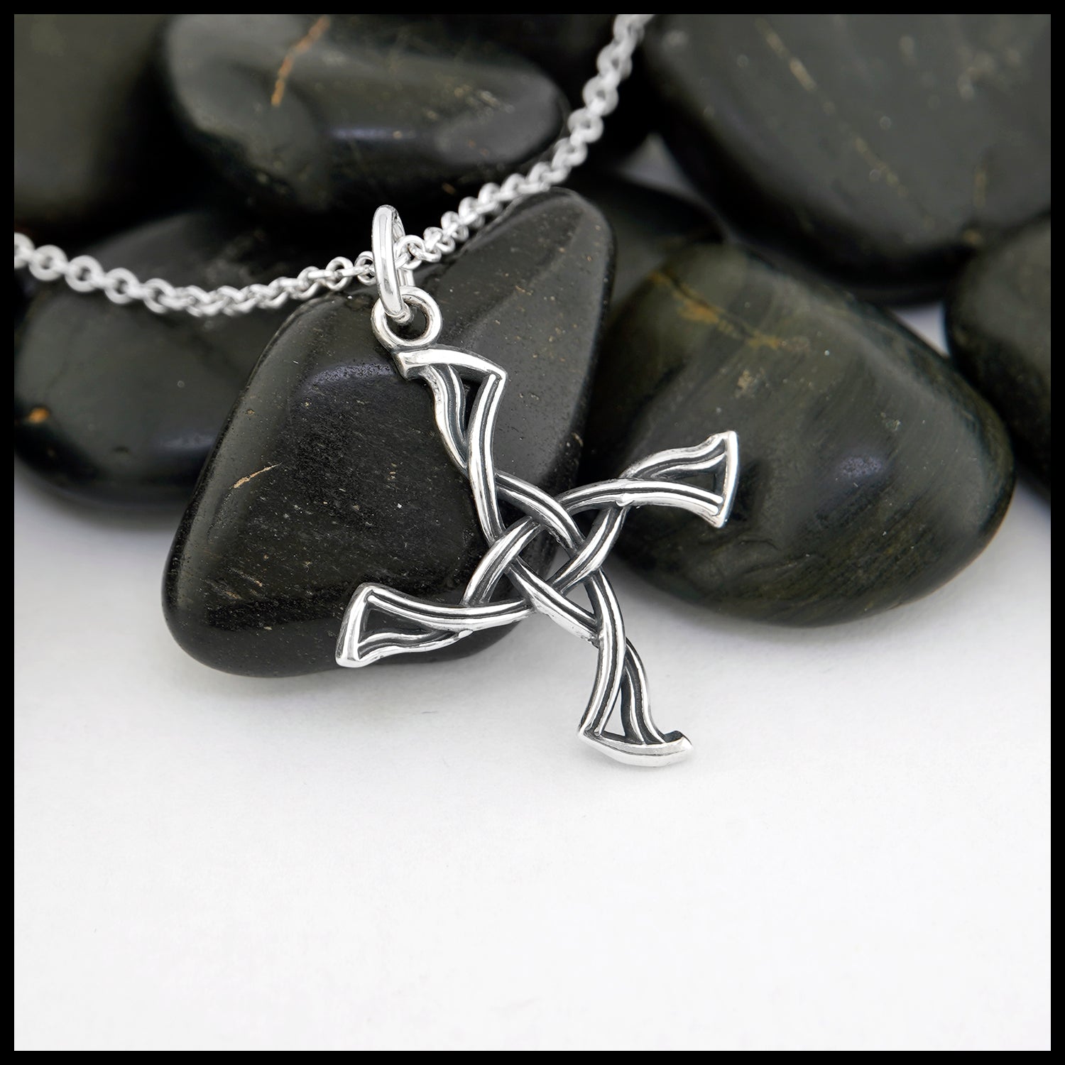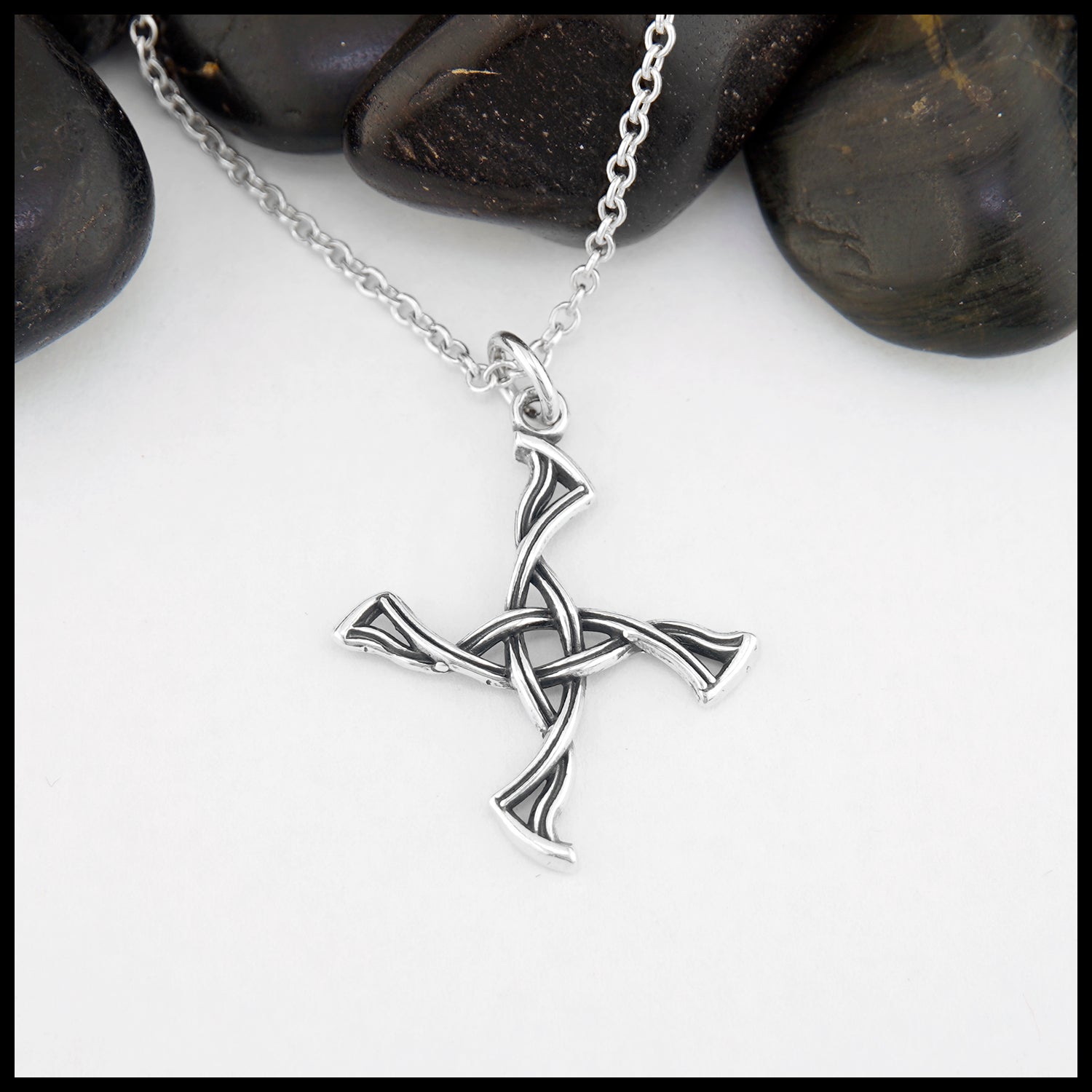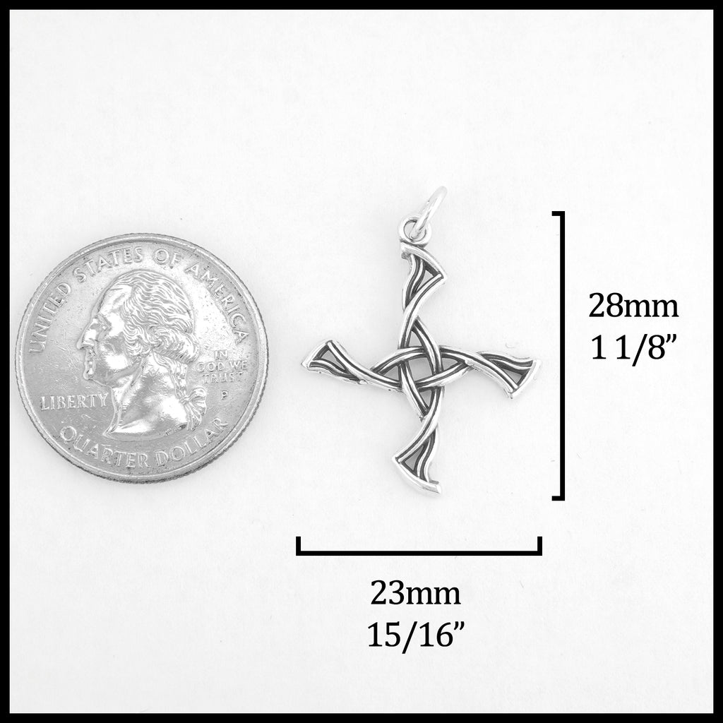 The St. Brigid's Cross pendant is named for Saint Brigid (Mary of the Gael) born in the mid 5th century. The legend goes that before her father's death Brigid sat by him in prayer, whiling away the time by weaving the first Saint Brigid cross from the rushes strewn about the floor.