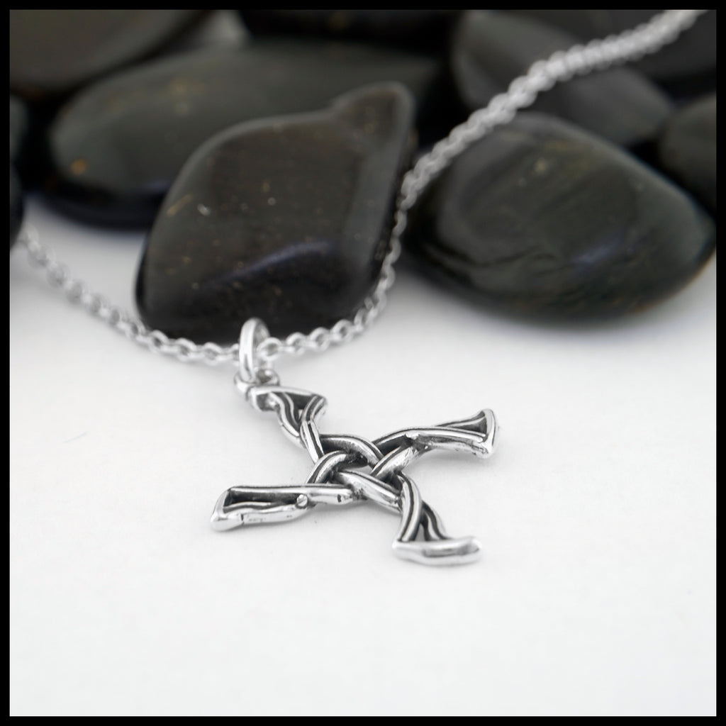 This St. Brigid's cross was made on the eve of St. Brigid's day by Stephen Walker as a new design for the year 2025. This pendant is shown on an 18" cable chain.
