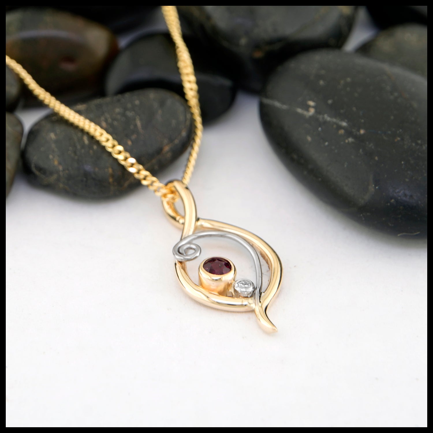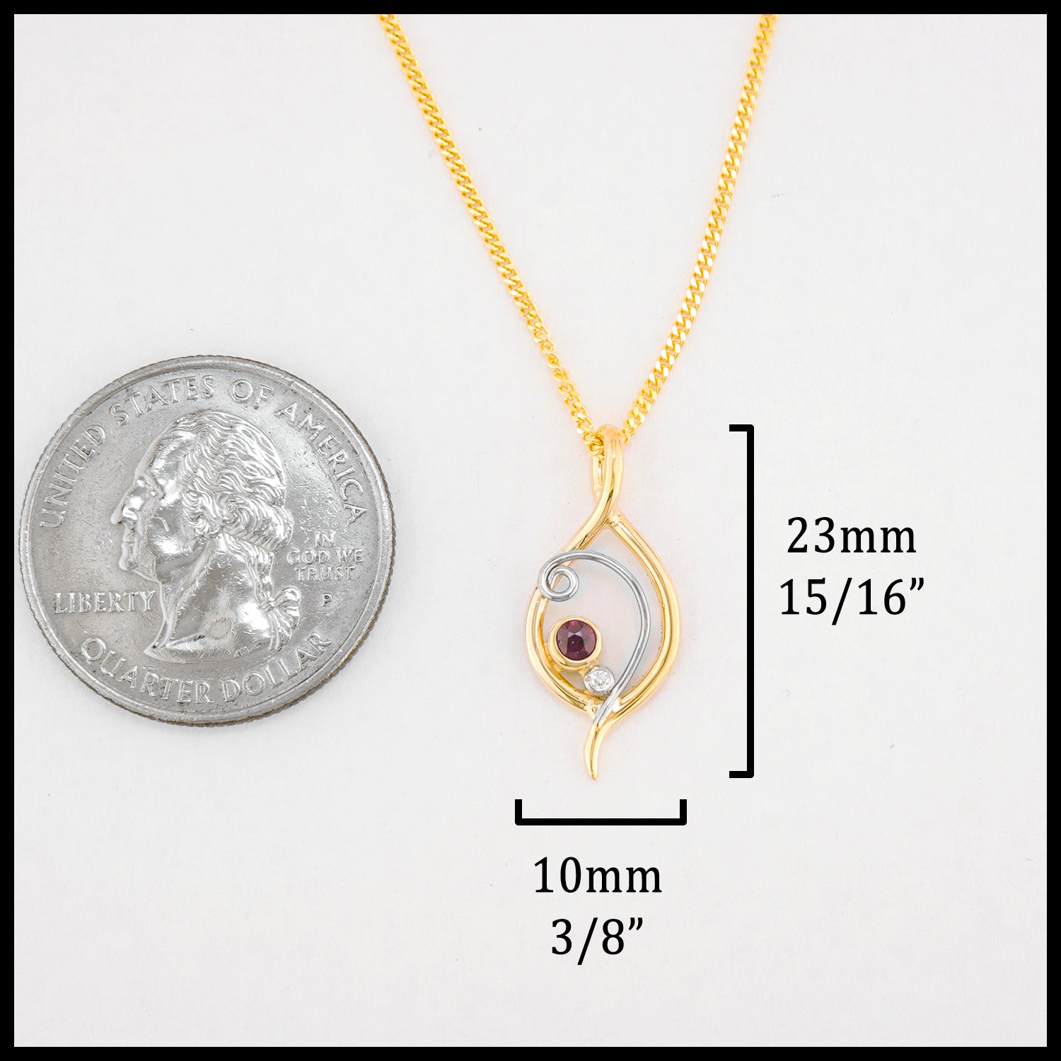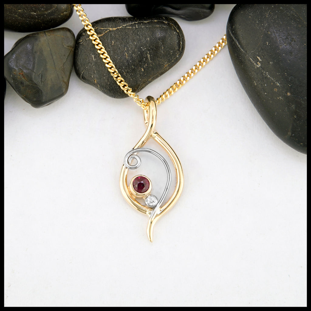 This beautiful custom pendant is made from a combination of 14K white and yellow gold and is set with both a Ruby and Diamond. This pendant comes with a 14K yellow gold 18" light curb chain.