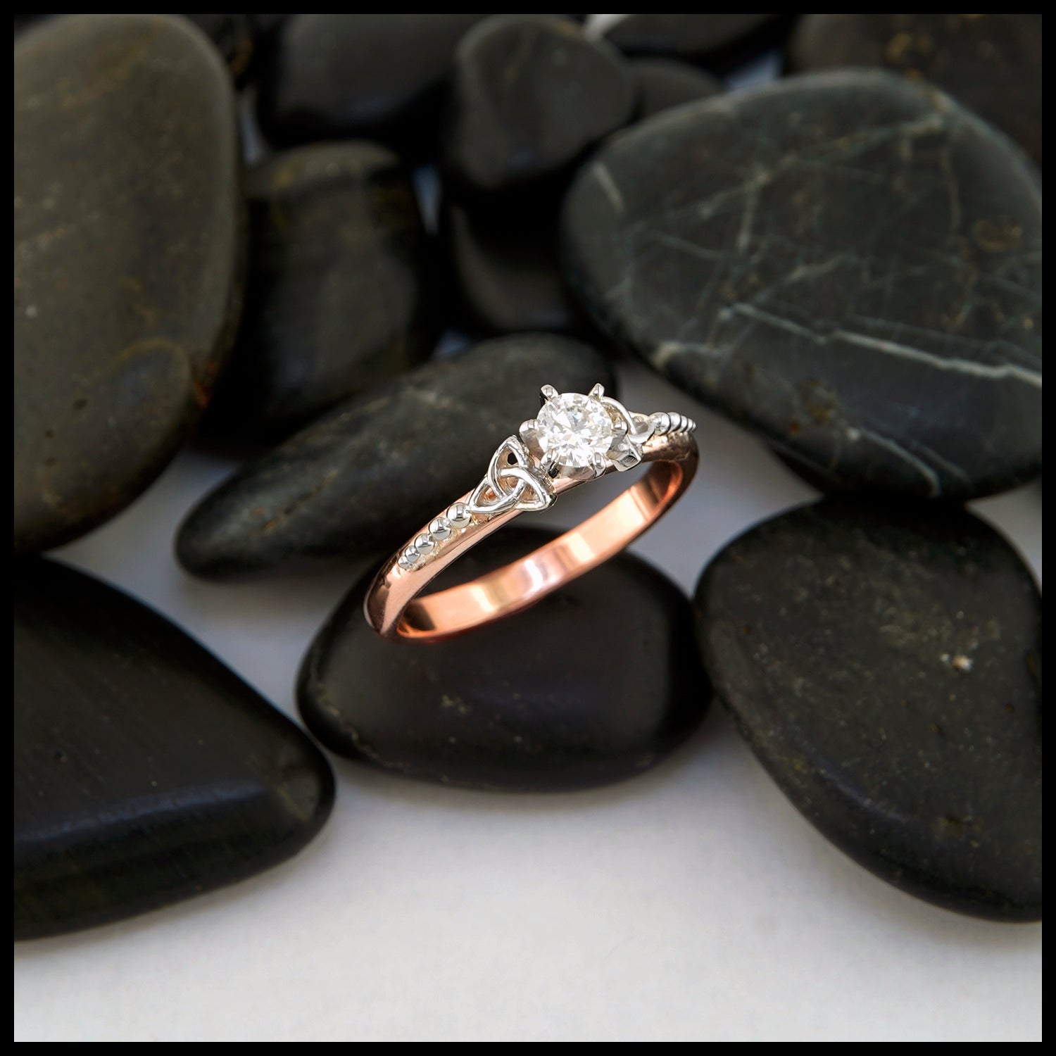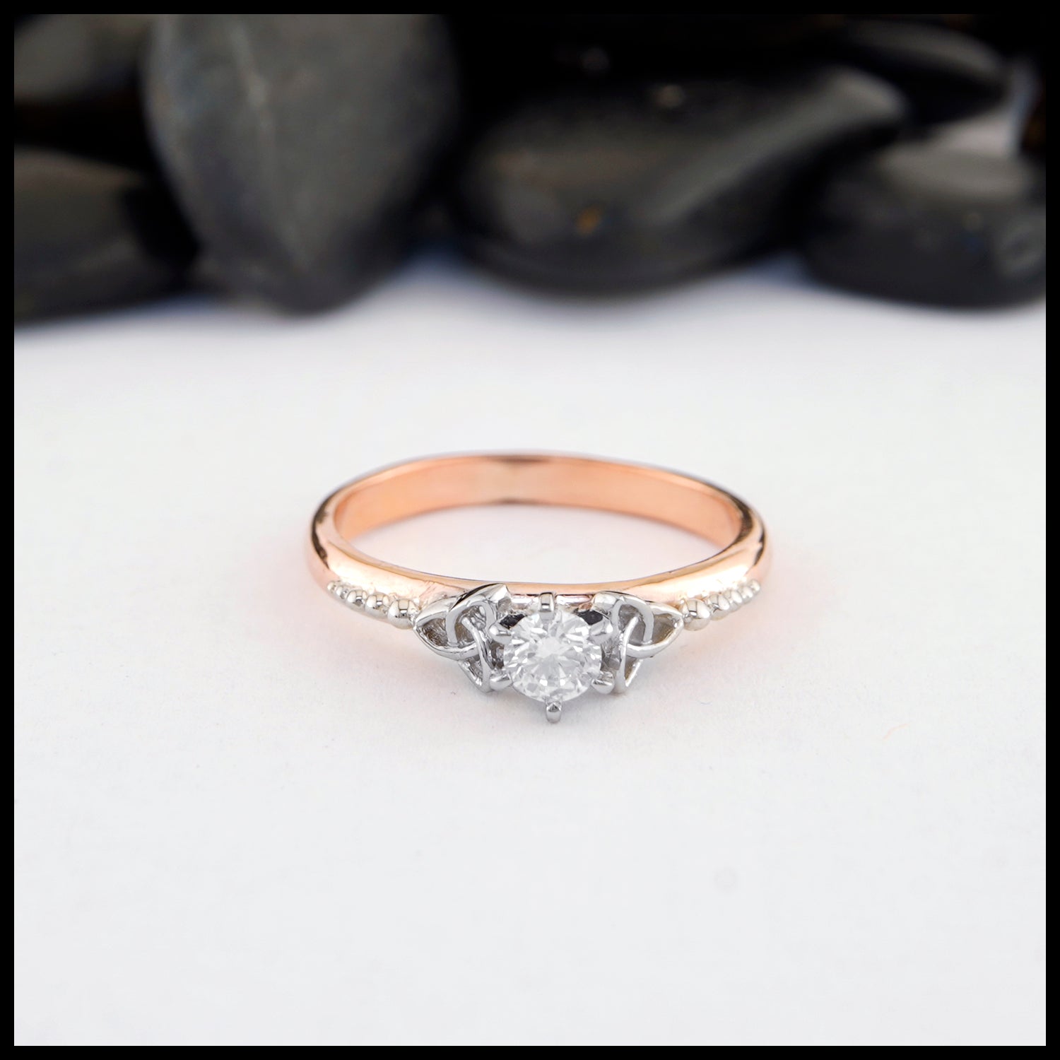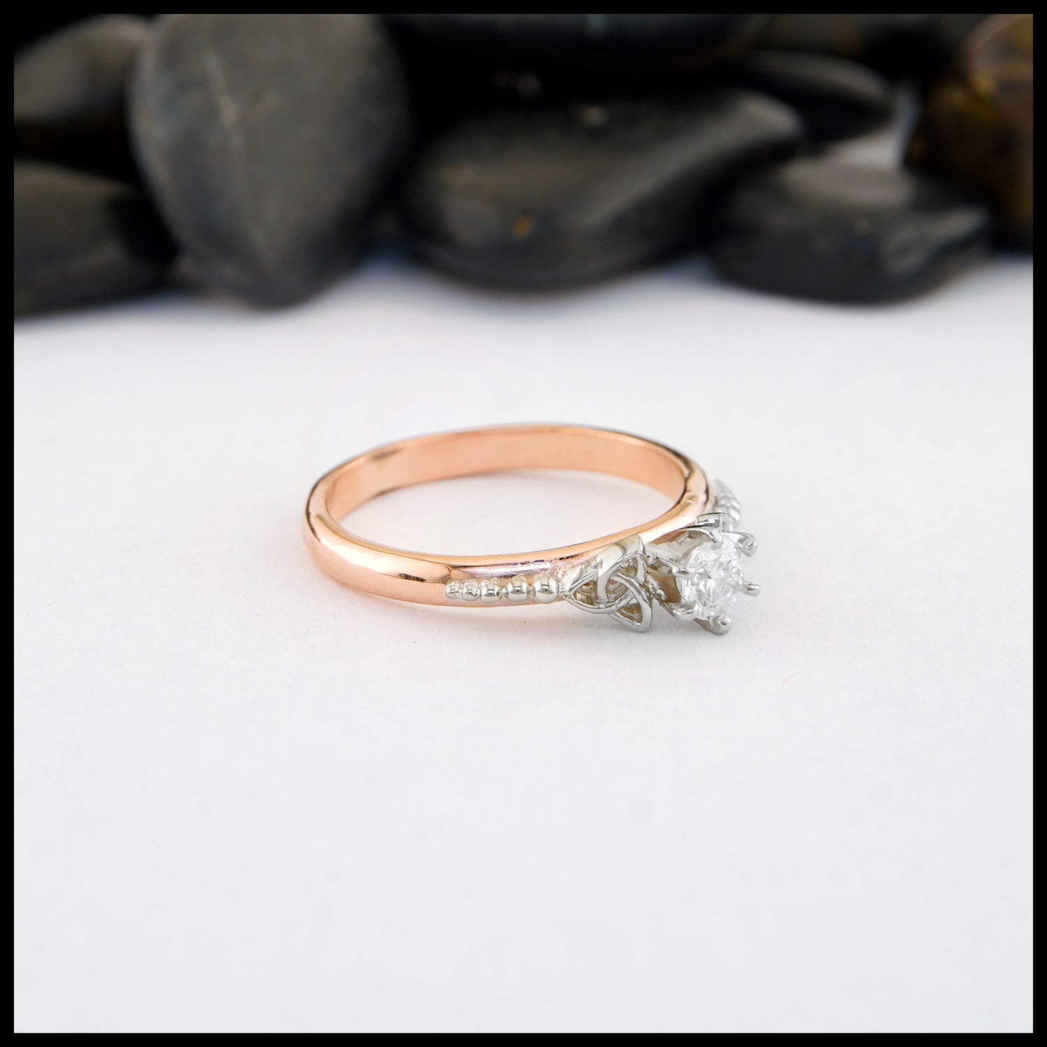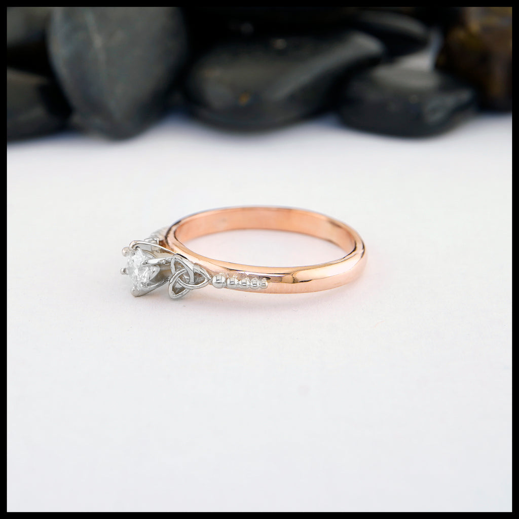This beautiful two tone ring has a 14K Rose Gold band with 14K White Gold Trinity knots and beading and is set with a 1/4CT Diamond. This ring is a size 7 1/2 and can be resized upon request.