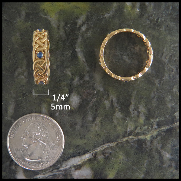 The Josephine's Knot Celtic Gold Ring with Gemstones is available in 14K Yellow, Rose or White Gold. We will set the band with your choice of Diamond, Tsavorite, Ruby, or Sapphire.