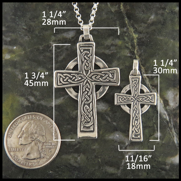 The Genesis Celtic Cross, shown here in sterling silver, is an original design by Stephen Walker inspired by Irish and Scottish Celtic traditions. This cross features a traditional Celtic cross profile and knotwork patterning. The Genesis cross is available in 2 sizes suitable for both men and women.