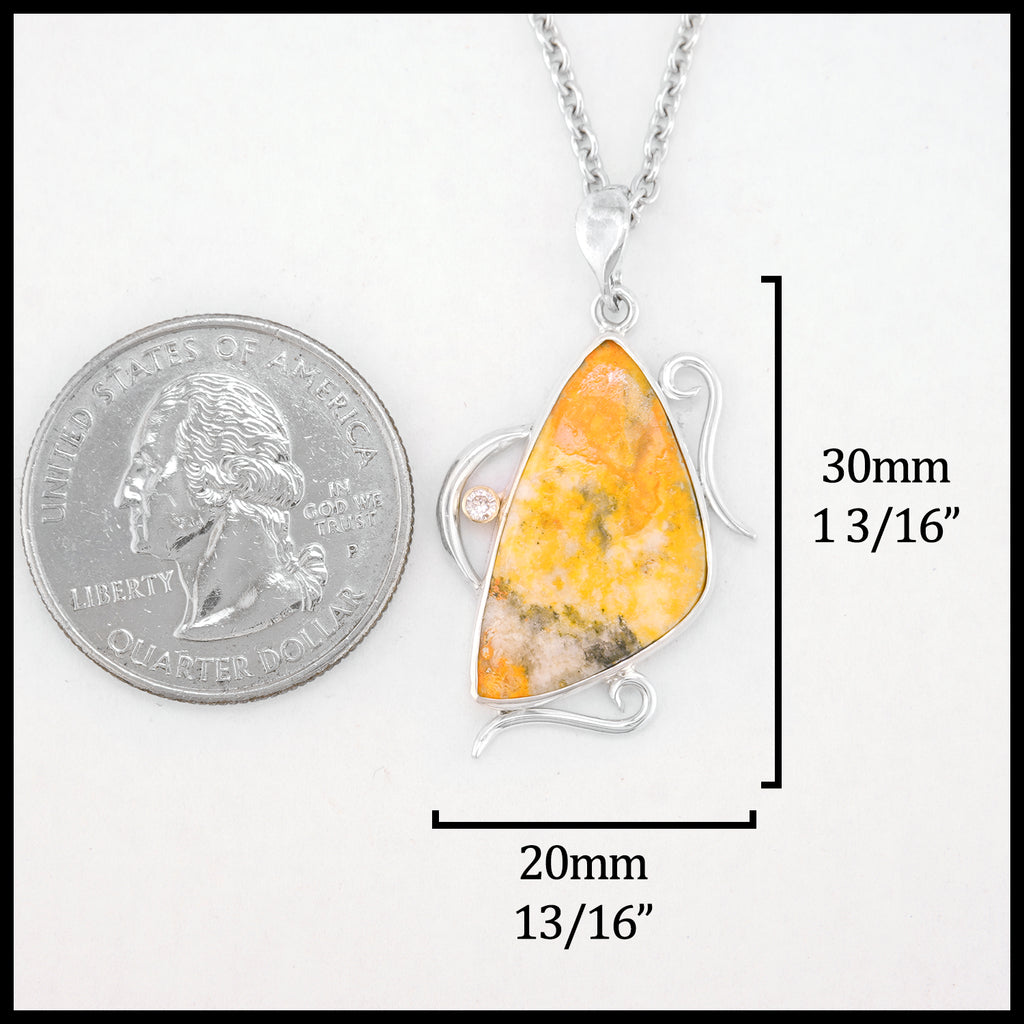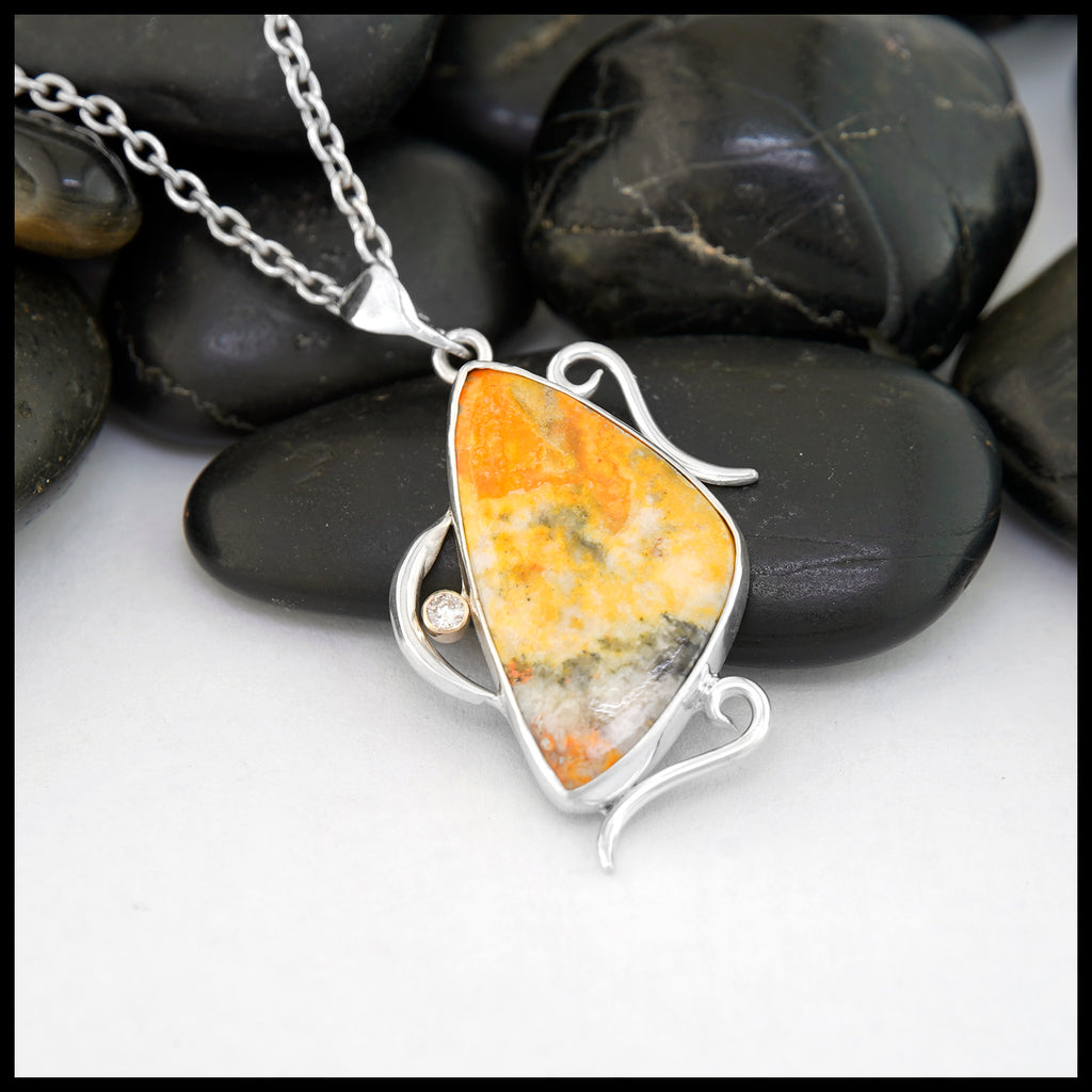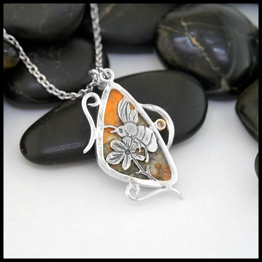 This gemstone pendant features a one of a kind bumble bee jasper set in a custom sterling silver bezel frame. The frame is decorated with handmade sterling silver accents, as well as a bezel set diamond in 14K yellow gold. The back of the pendant reveals an adorable bumblebee pollinating a flower! This pendant comes with an 18" cable chain.