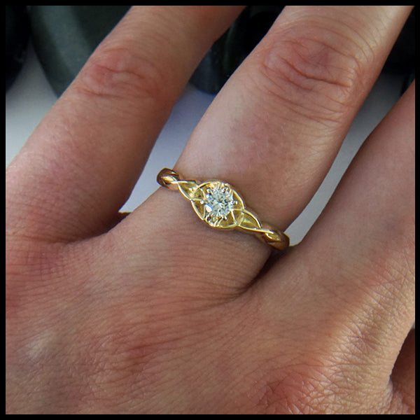 Triquetra Knot Celtic Ring in 14K Yellow Gold set with a 0.21ct center reclaimed diamond. This ring is currently a size 7.25, and can be resized.