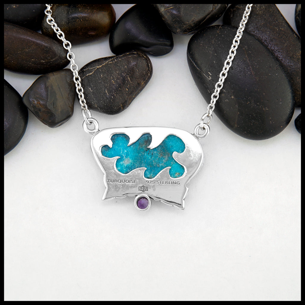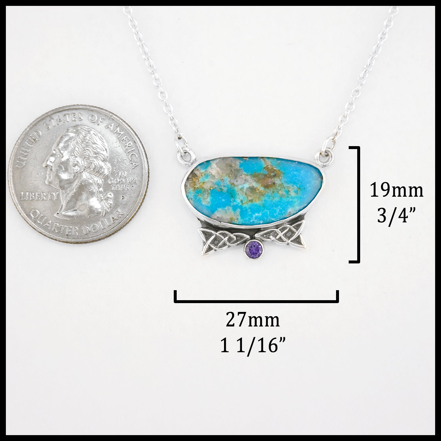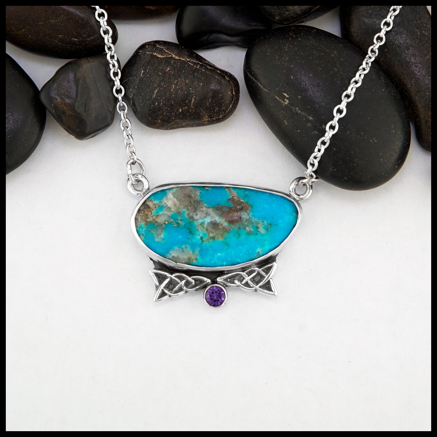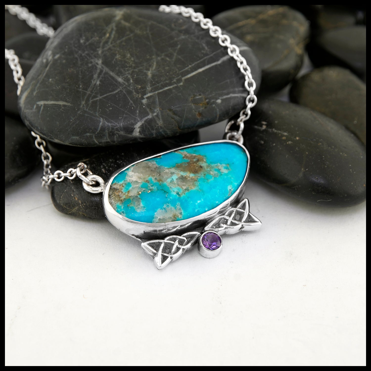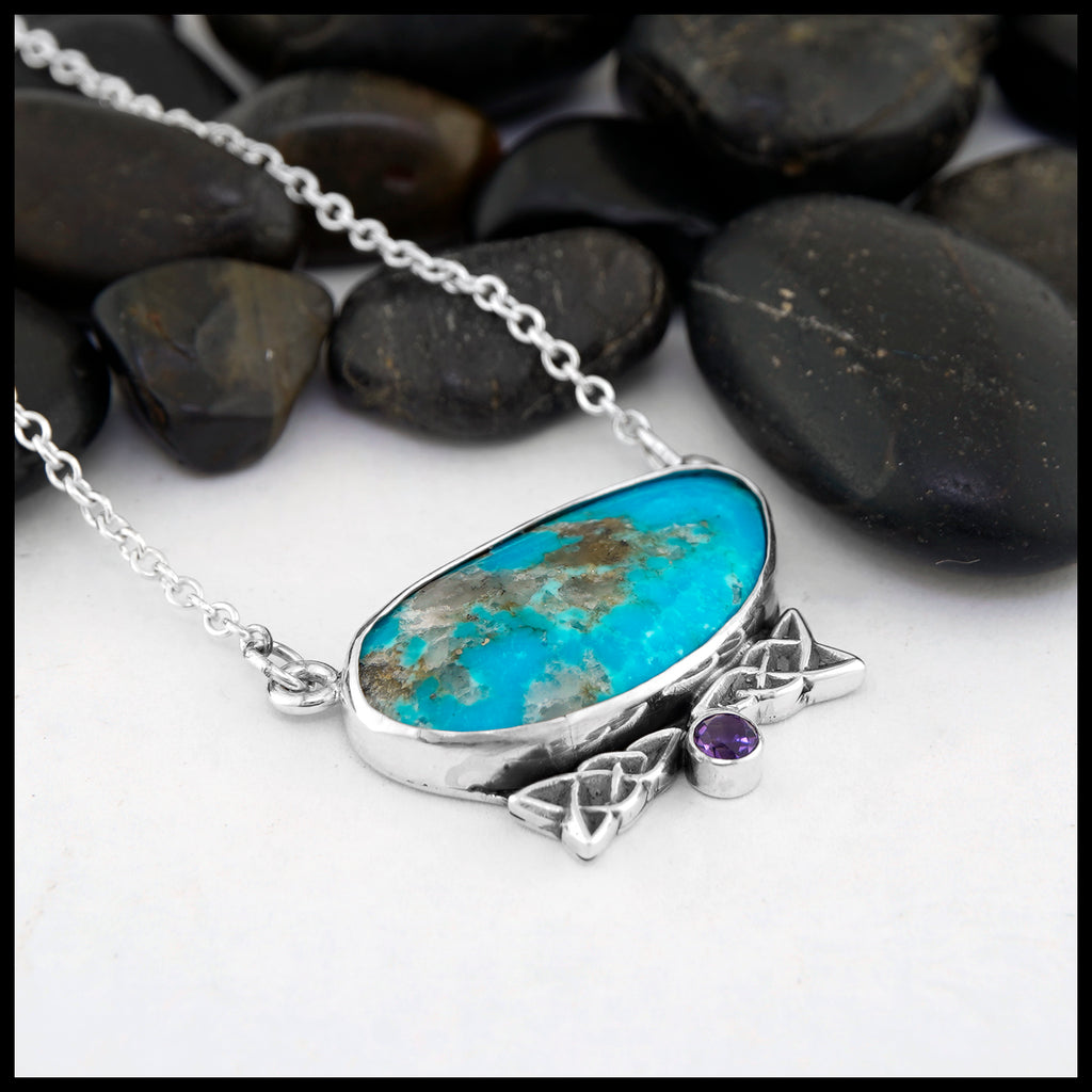This custom pendant showcases a turquoise decorated with Celtic knotwork and a bezel set amethyst. The back of the pendant list the name of the stone and has a custom cutout to see the stones pattern from behind. This pendant comes with an 18" cable chain.