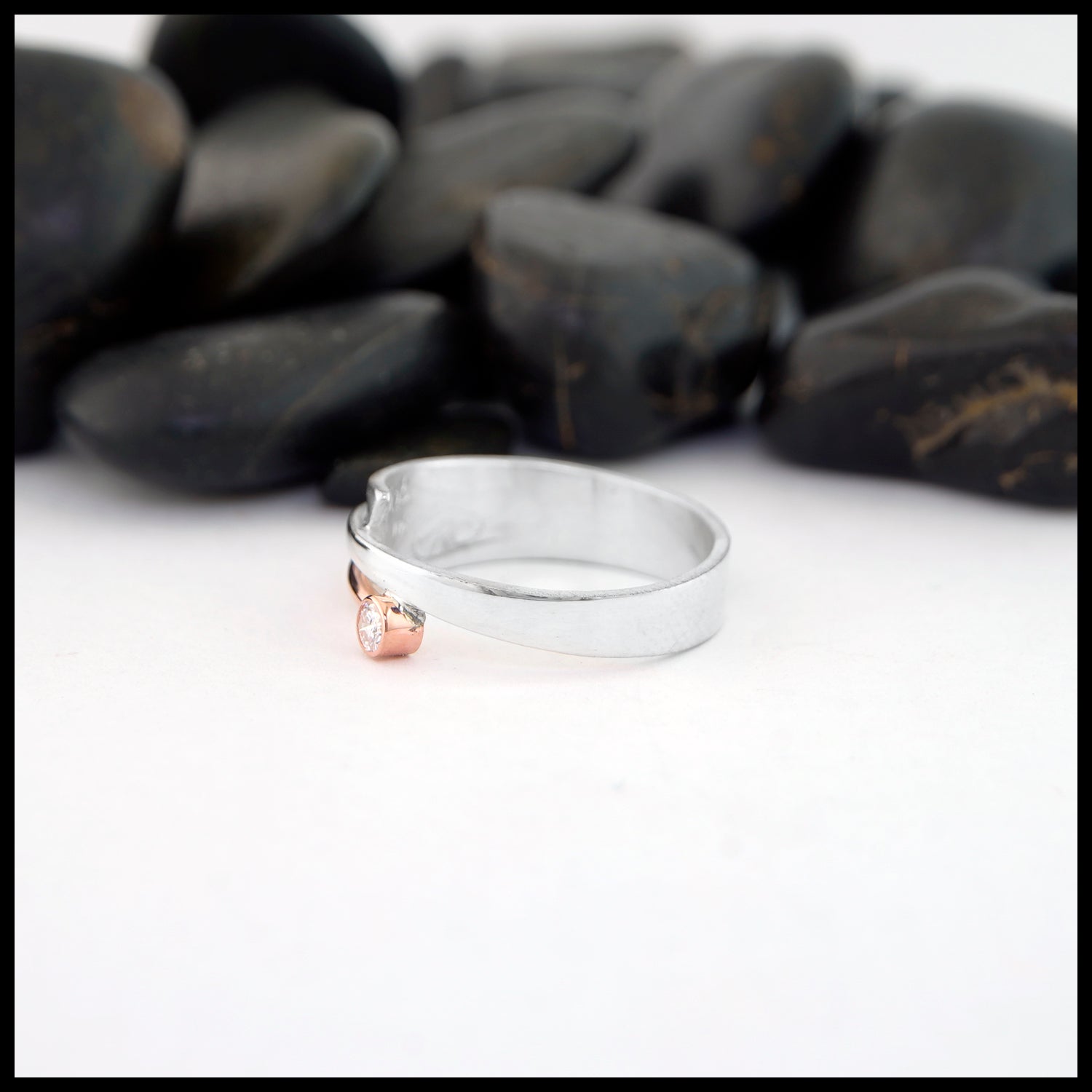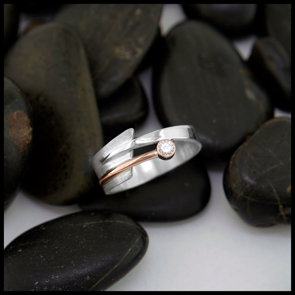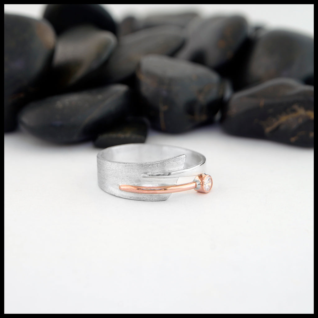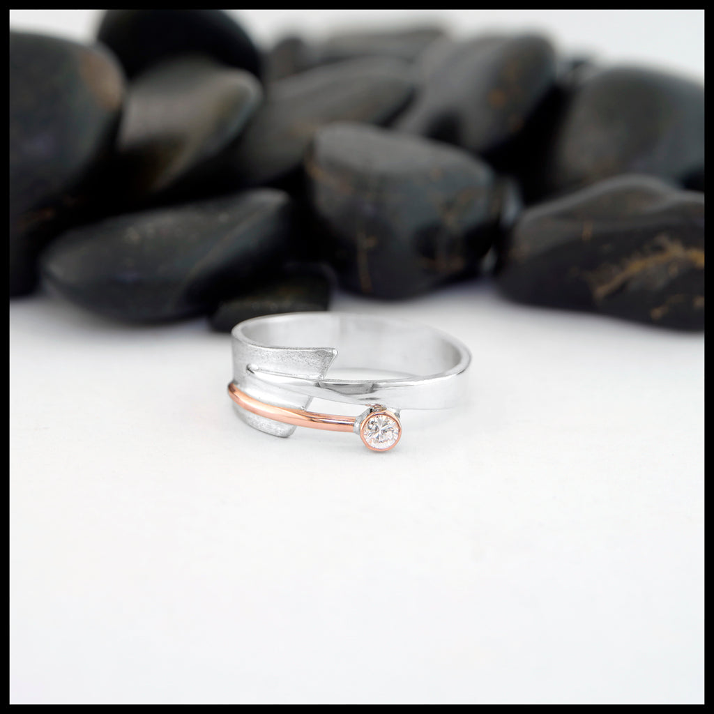 This ring showcases a bezel set .10CT diamond in a custom sterling silver and 14K rose gold band band. The band is decorated with overlapping textures and colors with half the silver on the band having a brushed finish while the other is a clean polish. This ring is a size 7 and can be resized upon request.