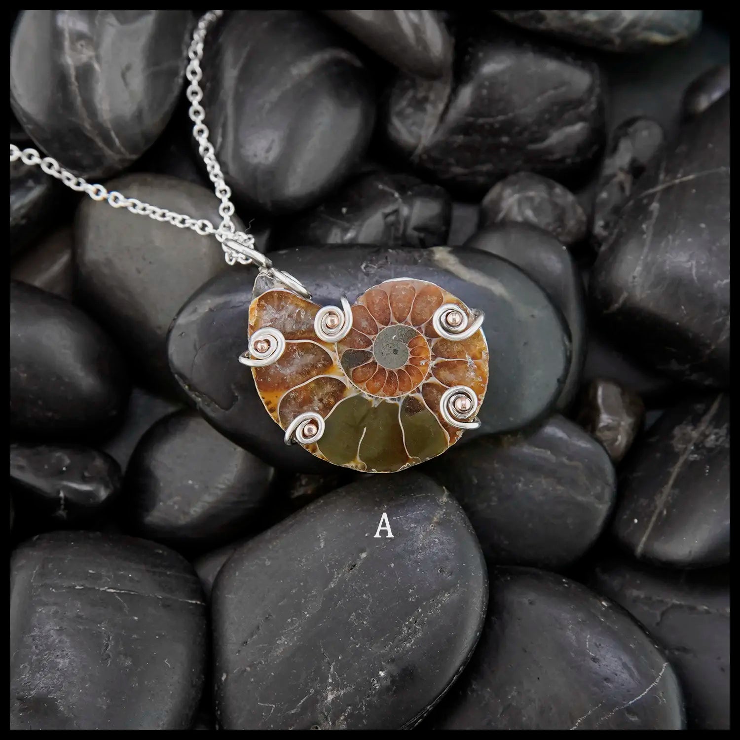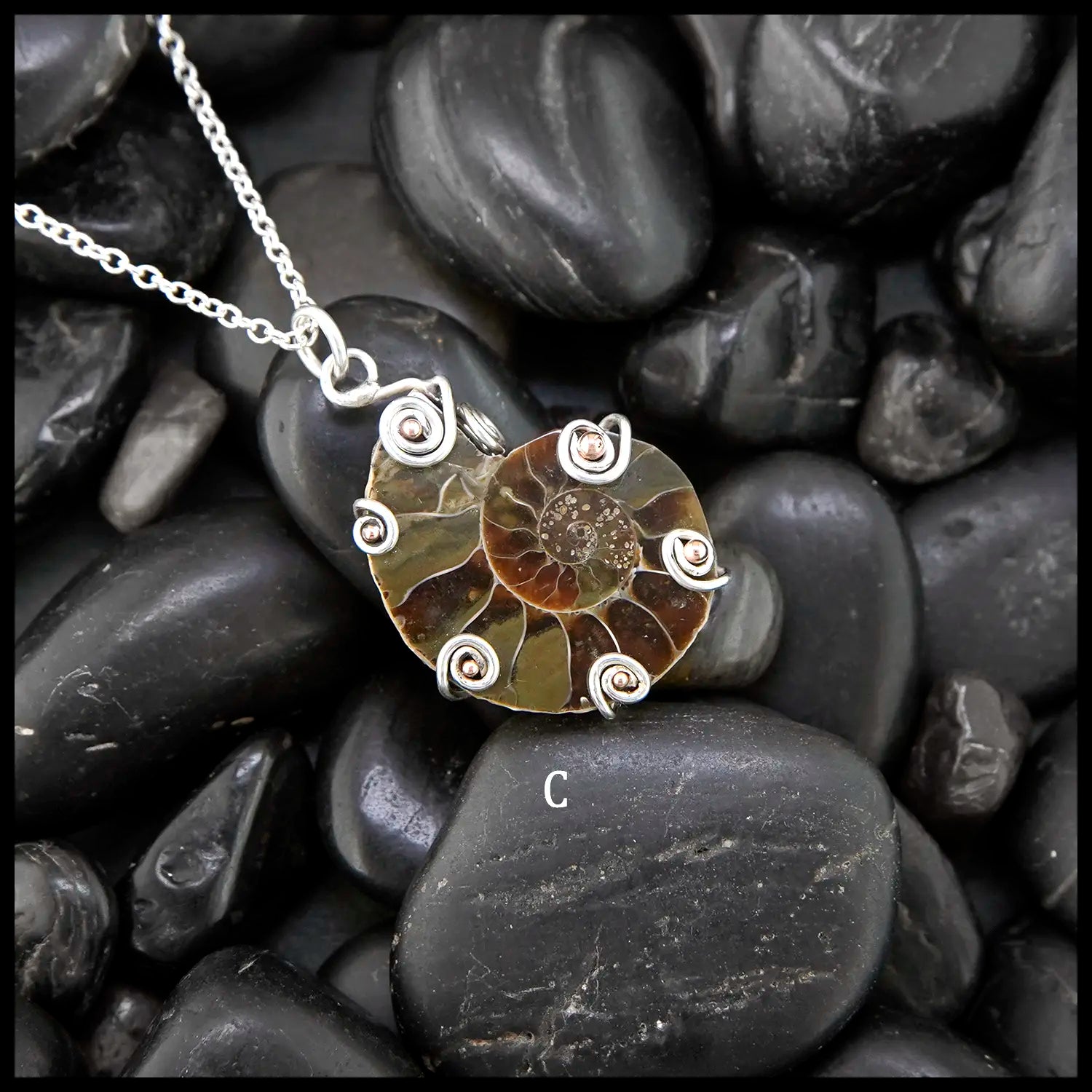 Wrapped in Sterling Silver Wire, these Ammonite Fossils date all the way back to the Jurassic Period! With 14K Rose Gold beads, and Sterling Silver Triskele spirals on the reverse- these unique pendants are one of a kind! Made by our craftsman Terry, each pendant comes on an 18" Cable Chain.