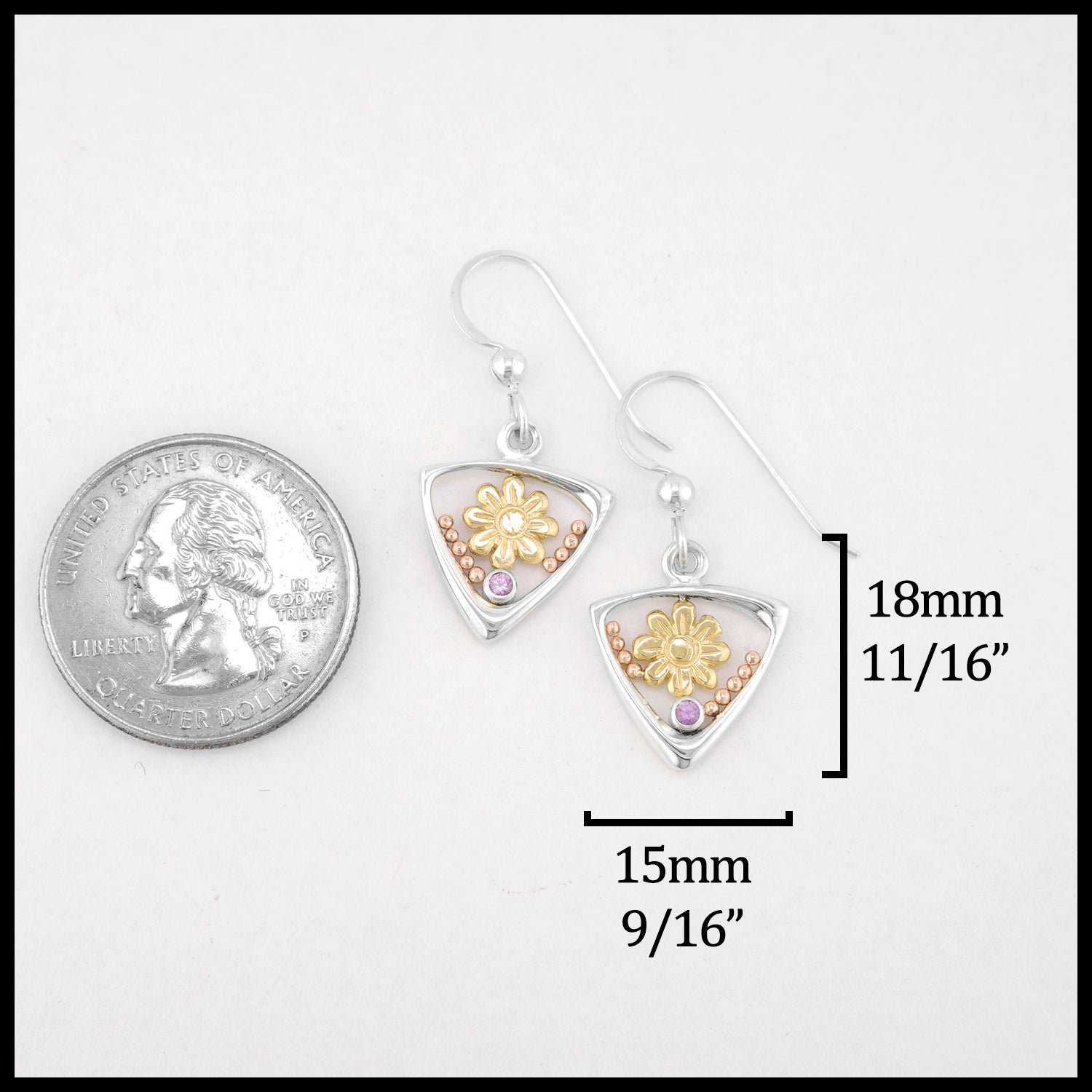 These custom earrings, created by our craftsman Nicole, feature a custom Sterling Silver frame with a 2mm bezel set Amethyst in each. Filling the frames are Daisies in 14K Yellow Gold along with 14K Rose Gold Beading.