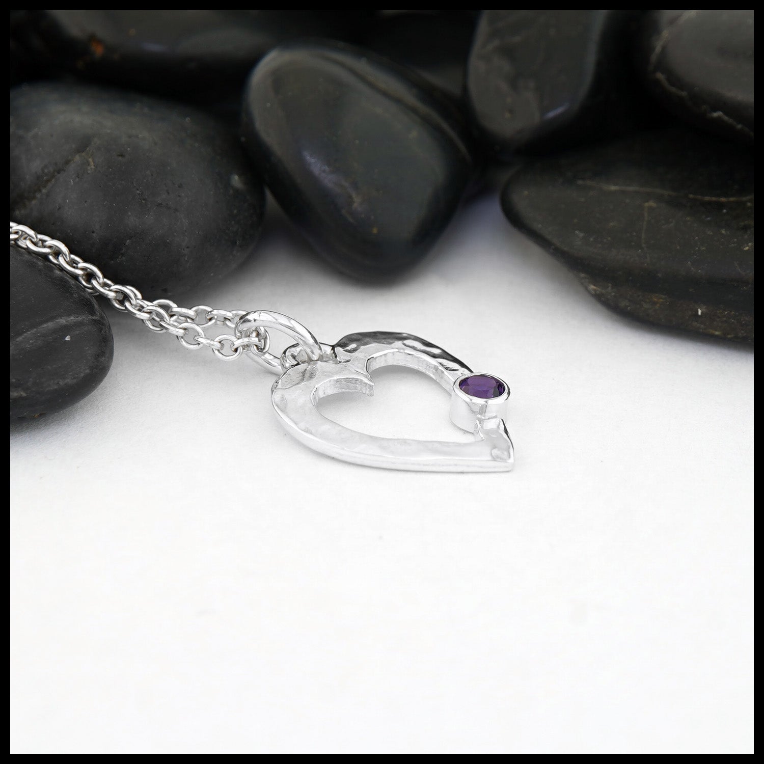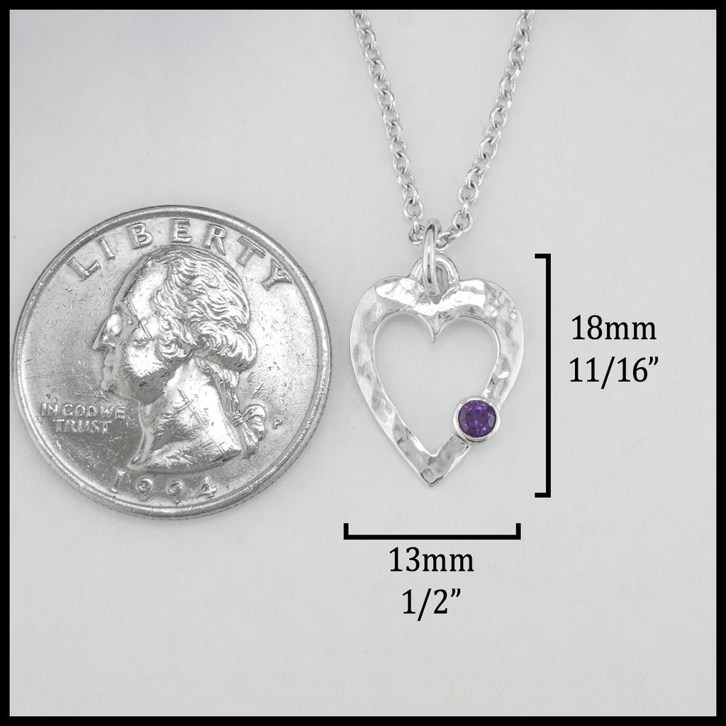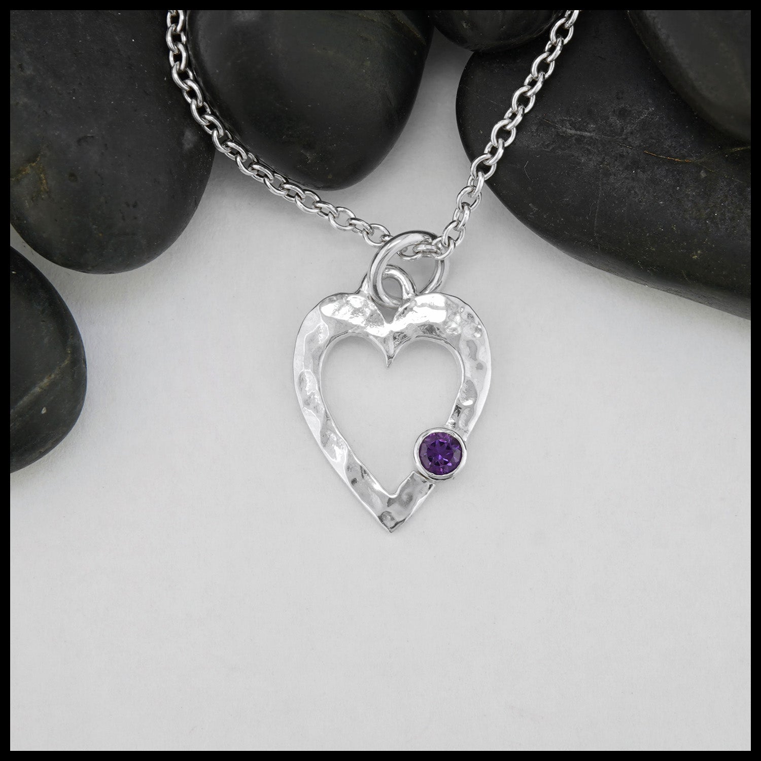 This sterling silver pendant crafted by Tom has a flattened frame and hammered texture finishing holding a bezel set amethyst gemstone. This pendant comes with an 18" cable chain.