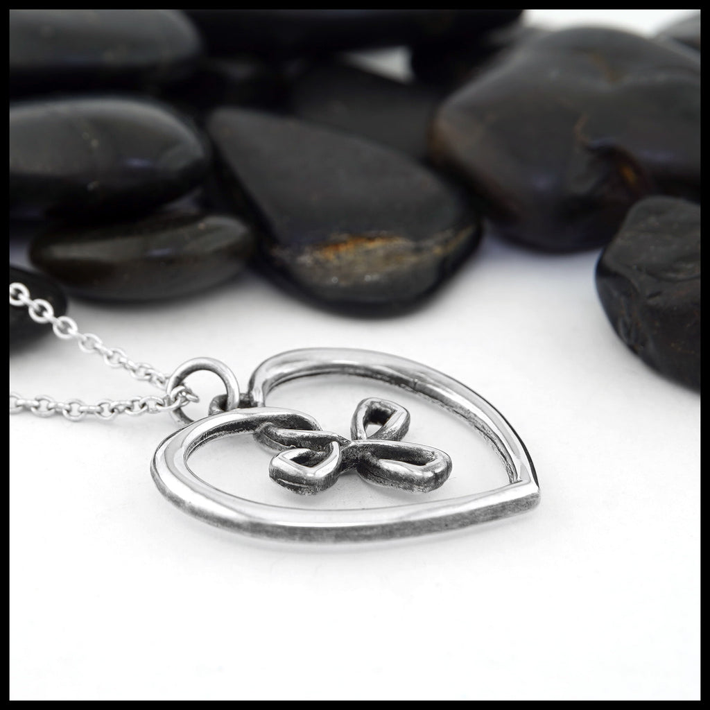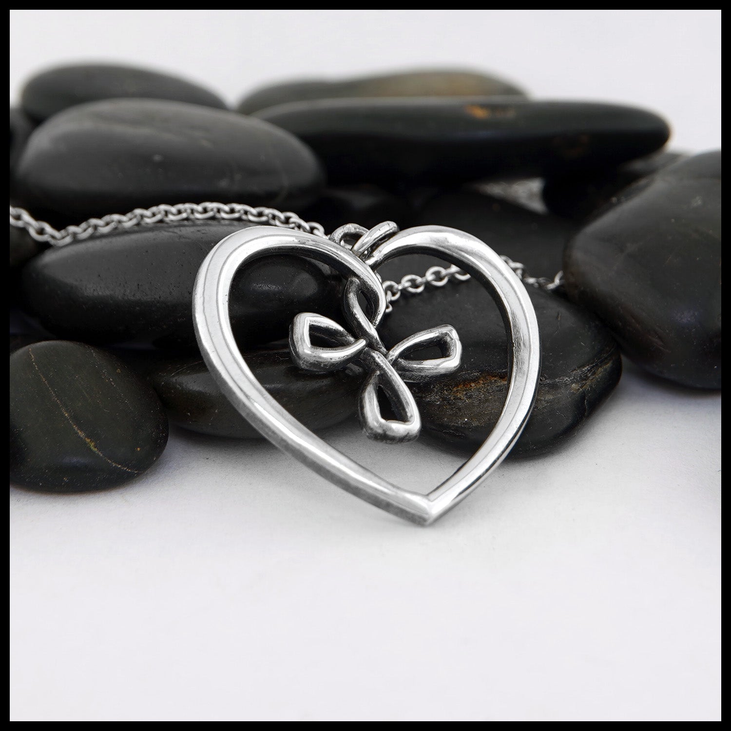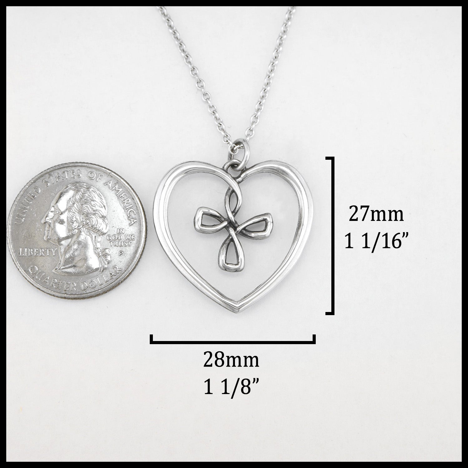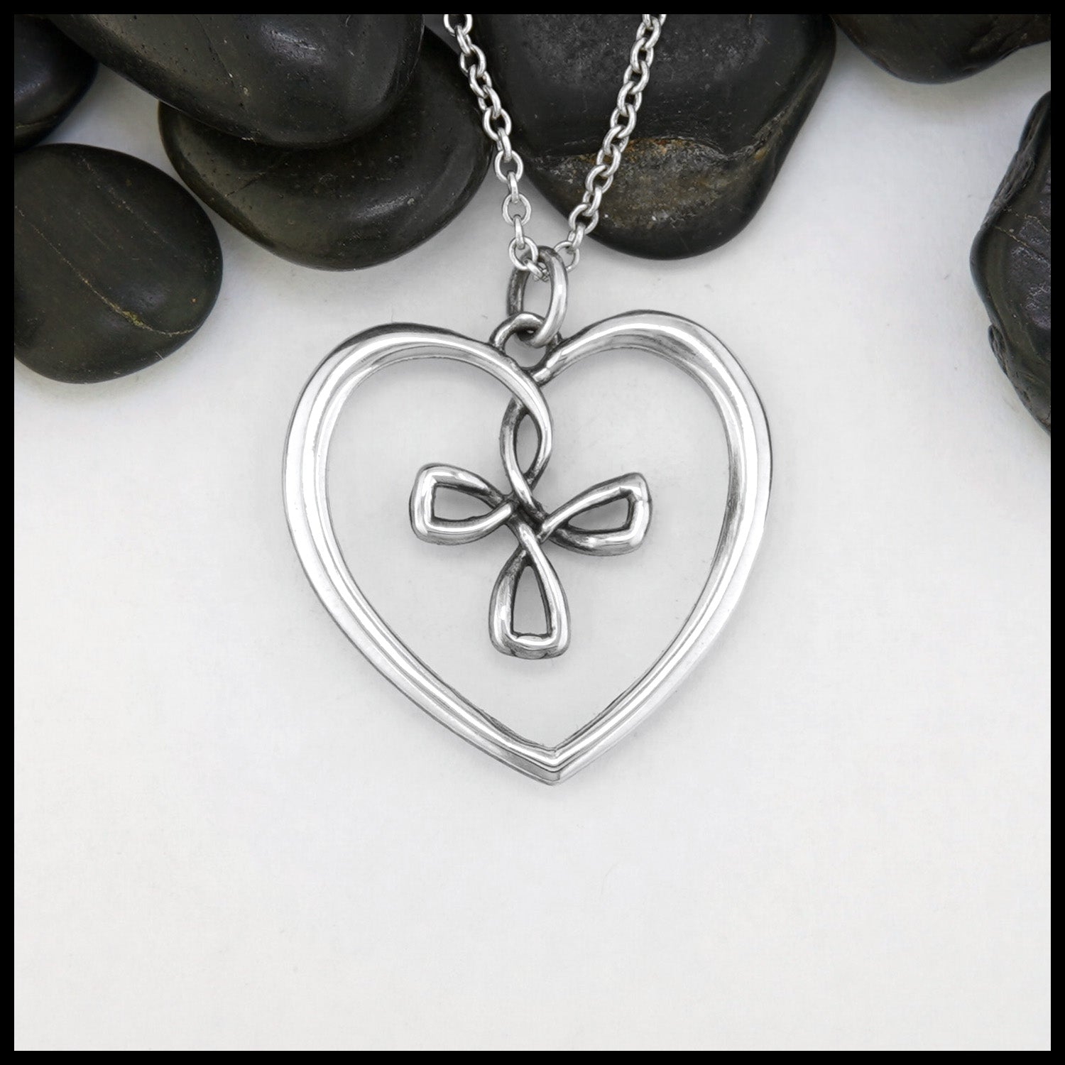 This sterling silver pendant is shaped in the form of a heart with a continuous frame twisting to create an open knot cross in the center of the heart. This pendant is featured on an 18" cable chain.