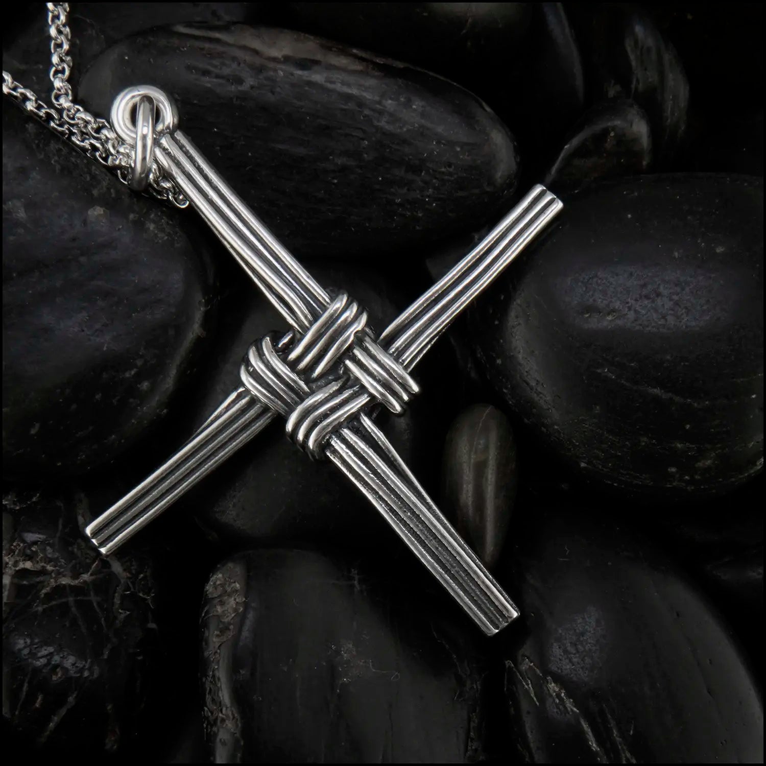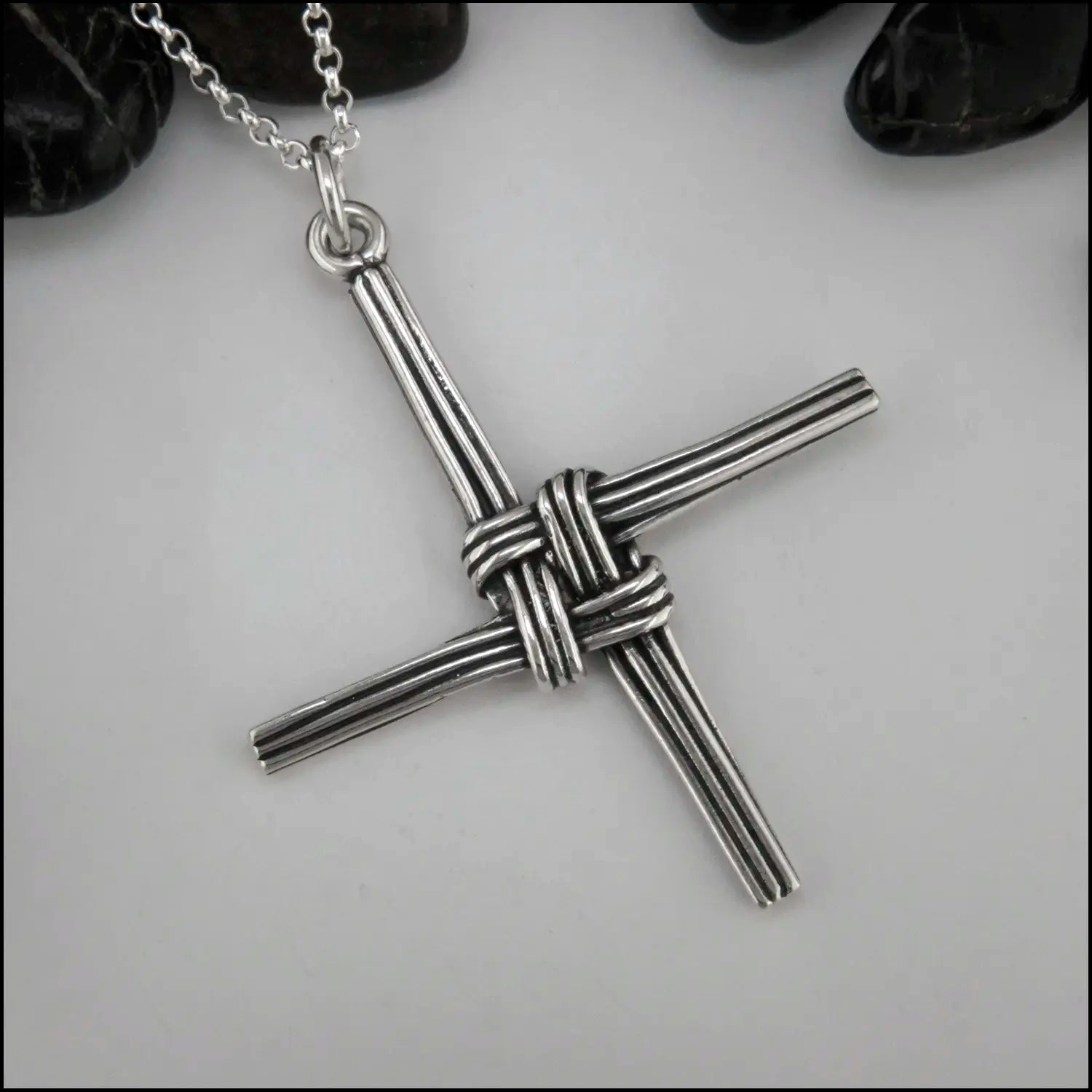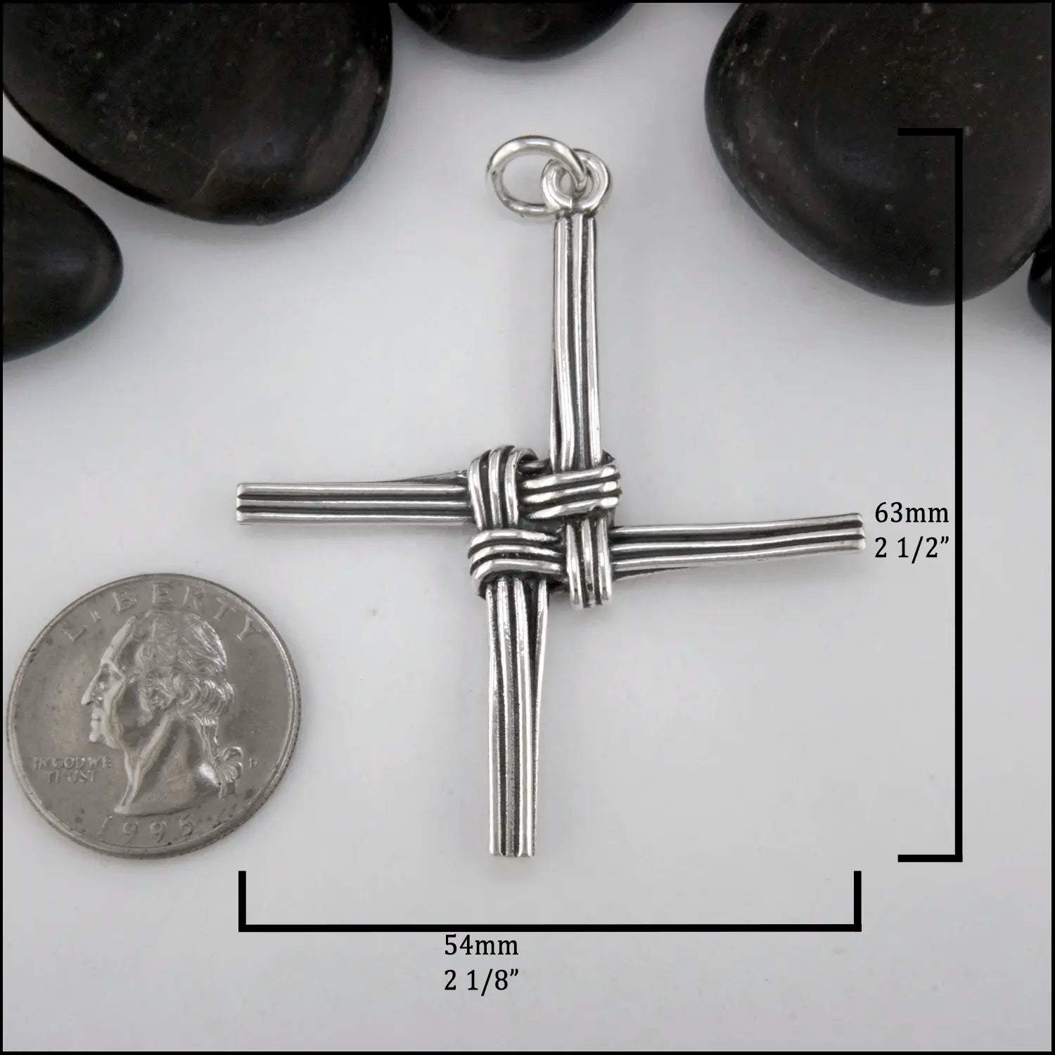 The St. Brigid Cross pendant is named for Saint Brigid (Mary of the Gael) born in the mid 5th century. The legend goes that before her father's death Brigid sat by him in prayer, whiling away the time by weaving the first Saint Brigid cross from the rushes strewn about the floor.