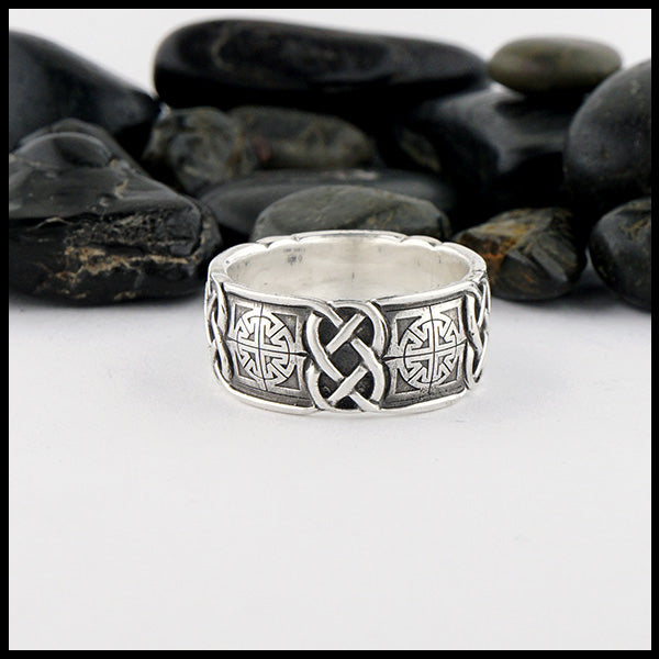 This ring combines the classic Josephine’s knot with what may appear to be a very modern geometric detail, but is actually a Celtic key Pattern derived from the 9th century Irish manuscript, the Book of MacDurnan. Máel Brigte MacDurnan was abbot of Armagh in the year 888 AD. The medieval manuscript bearing his name was commissioned by him in the late 9th century in the classic Insular/Celtic style. The abbot and his book are the only surviving references to the name MacDurnan.