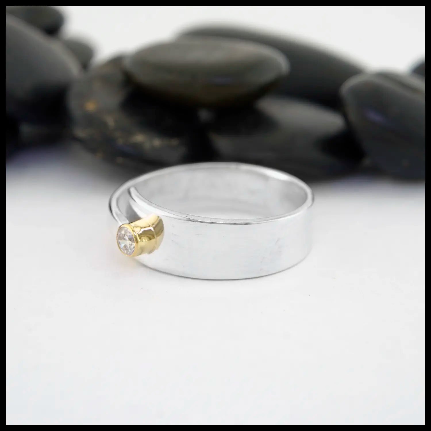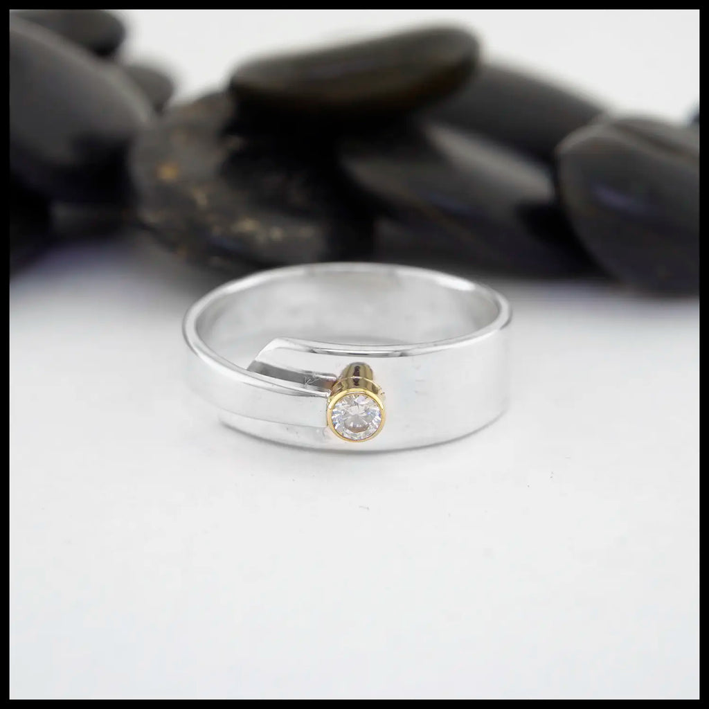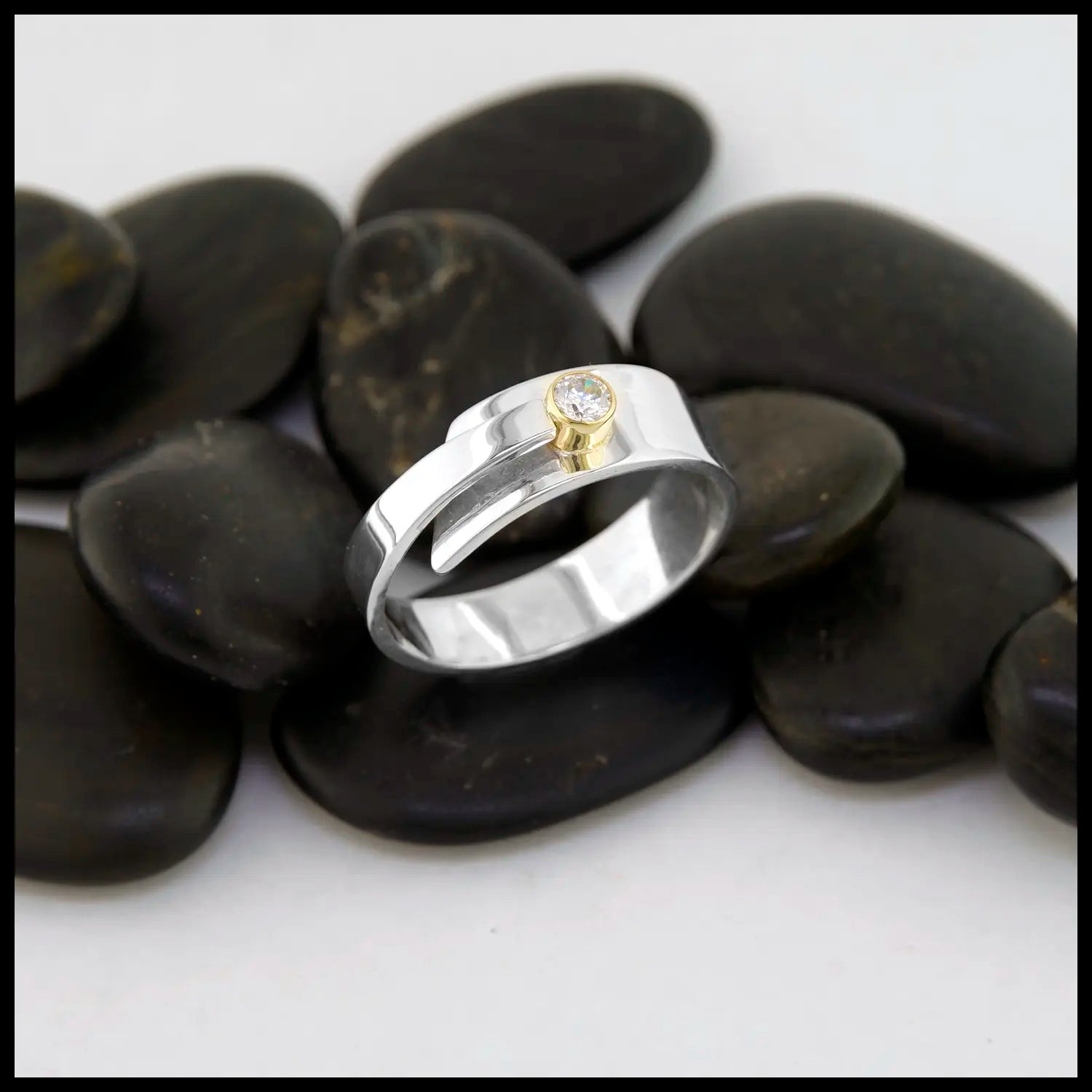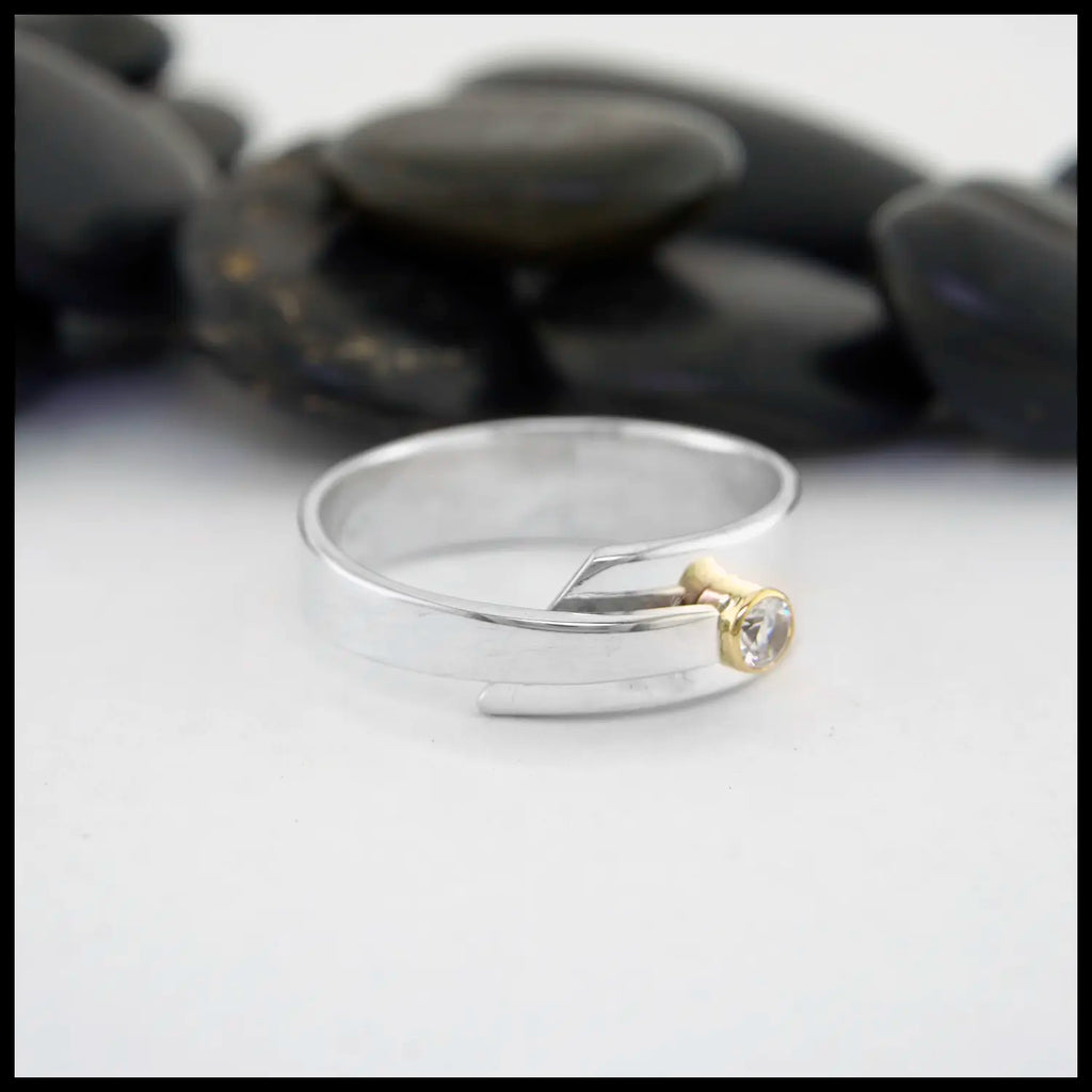 This ring showcases a bezel set .10CT diamond in 14K yellow gold in a custom sterling silver band. The band showcases an overlapping design as it links to the diamond. This ring is a size 8 1/2 and can be resized upon request.