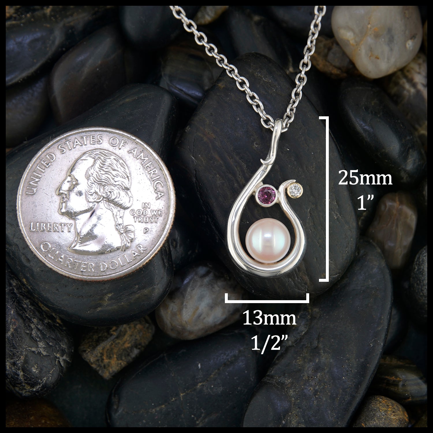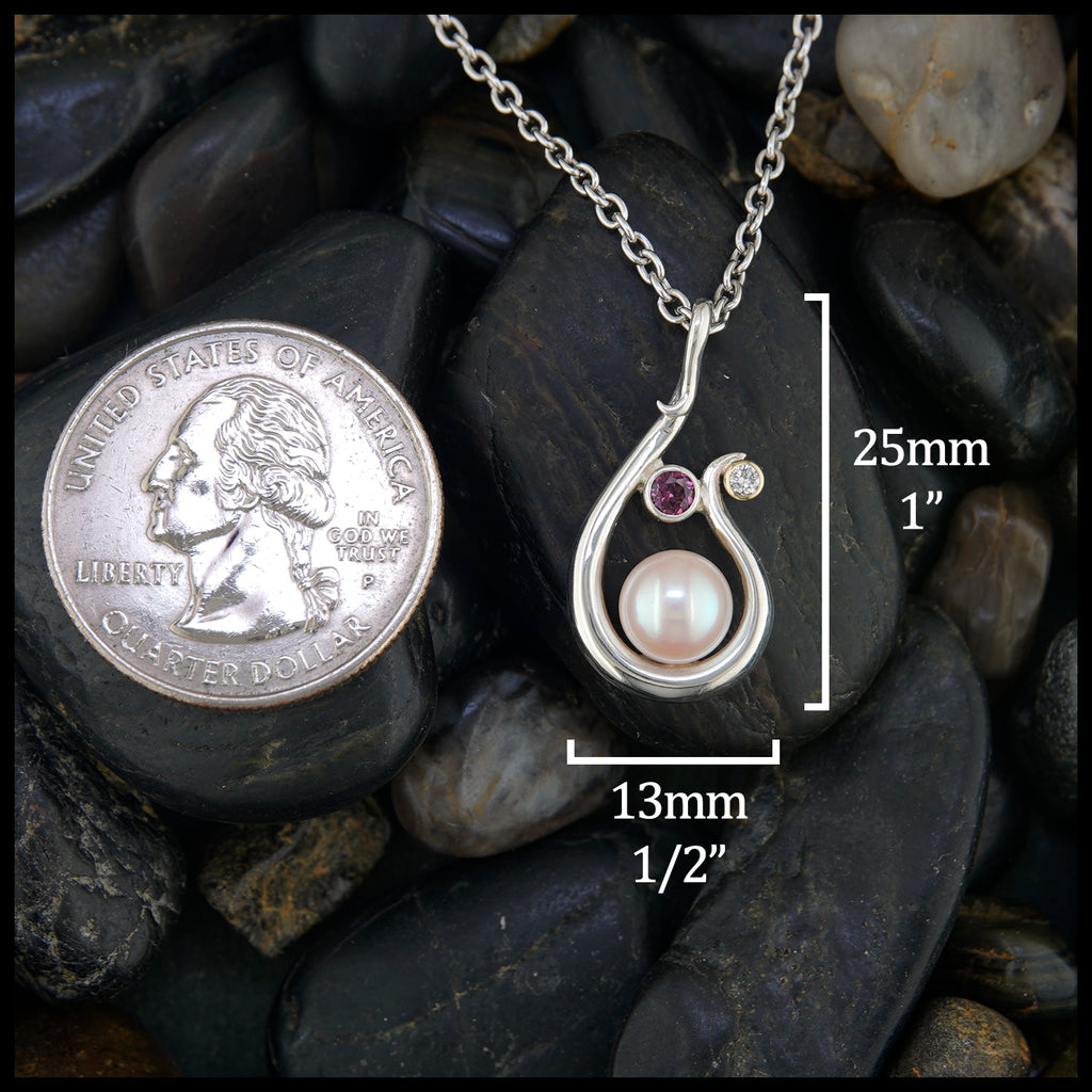 This pendant features a pearl set in a custom sterling silver frame decorated with a bezel set diamond in 14K yellow gold and grape garnet in sterling silver. This pendant comes with an 18" cable chain attached.