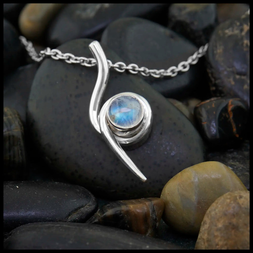 This unique pendant features a rainbow moonstone set in a custom swirling sterling silver frame. This pendant comes with an 18" cable chain.