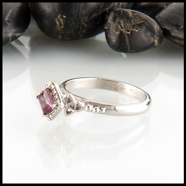 A stunning ring set with a center 1.59ct oval Purple Garnet, surrounded by 10 2.5mm...