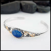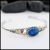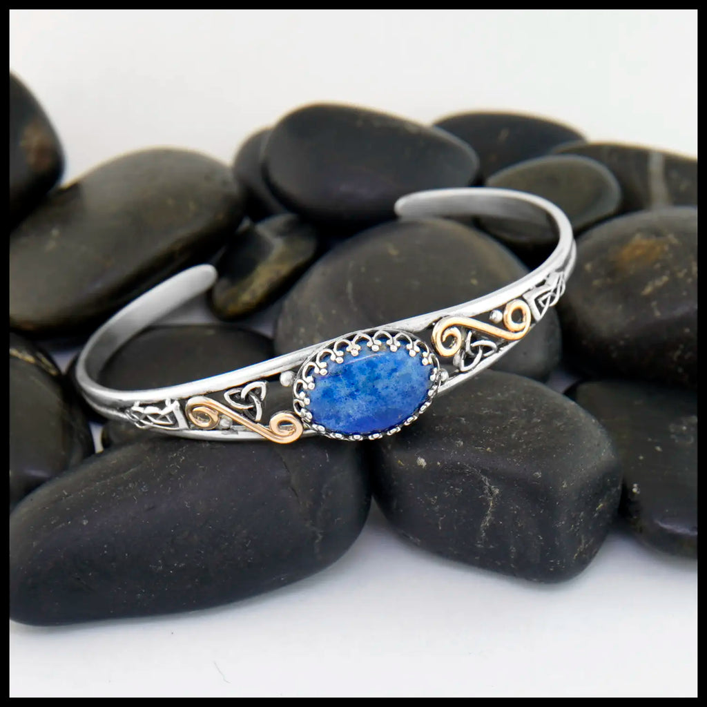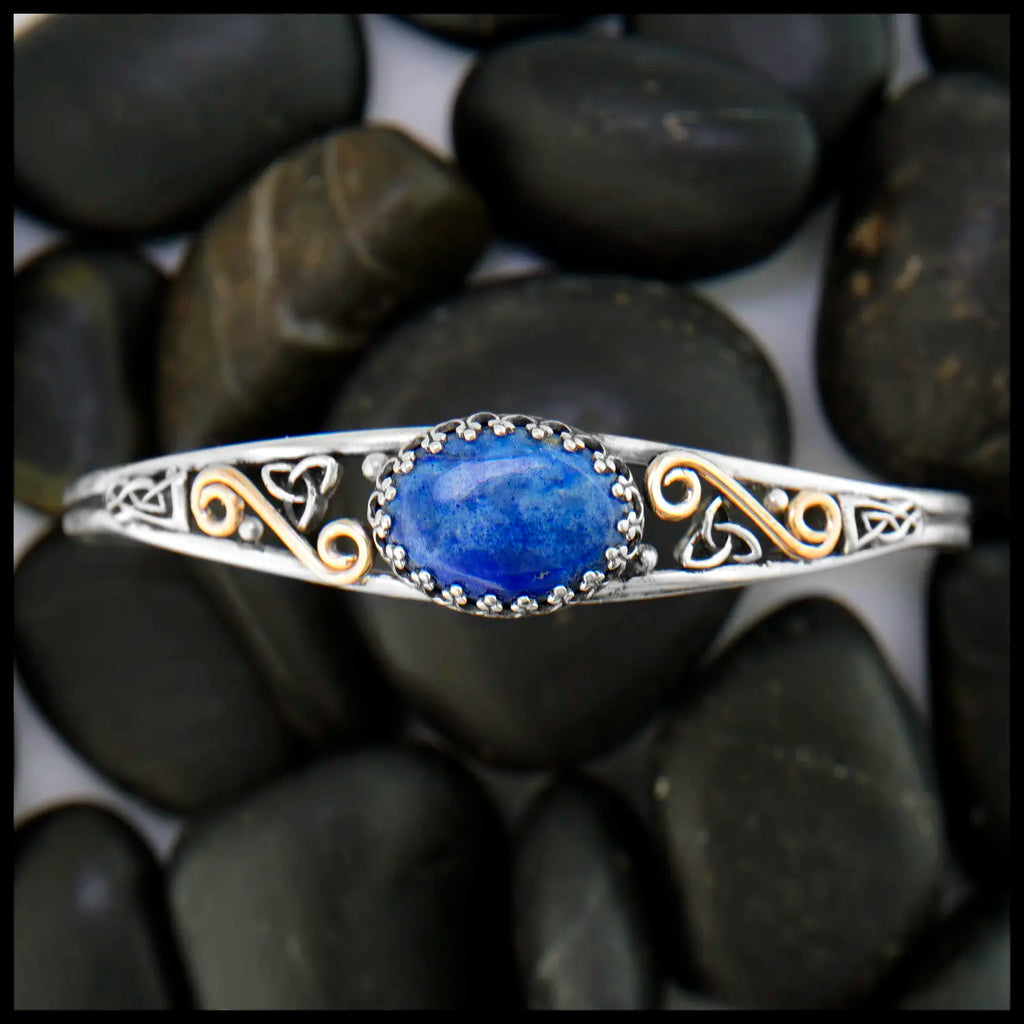 Custom and distinct, this cuff bracelet is set in a Sterling Silver frame with Open Trinity Knot accents and beads to match! Highlighting the deep blue Sodalite a 14K gold filled spiral details in Yellow Gold. This bracelet fits a 7 inch wrist.