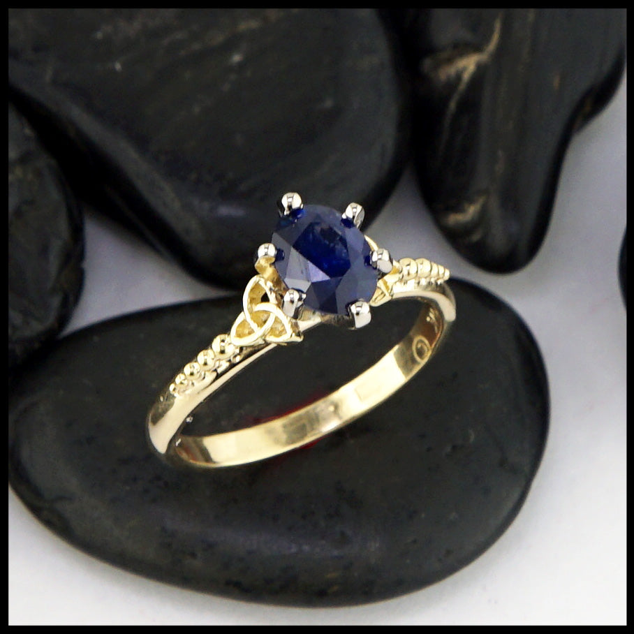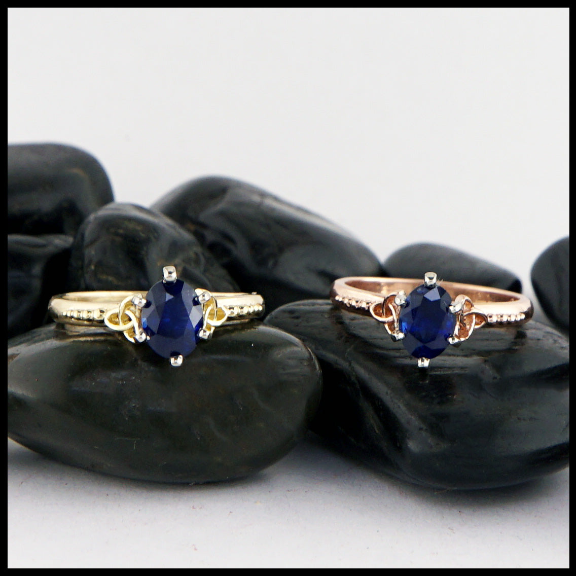 Trinity Knot ring in your choice of 14K White Gold, 14K Yellow Gold, 14K Rose Gold. There are trinity knots on either side of the 7.5x5.5mm Blue Sapphire. Pictured rings are 14K Rose Gold and 14K Yellow Gold