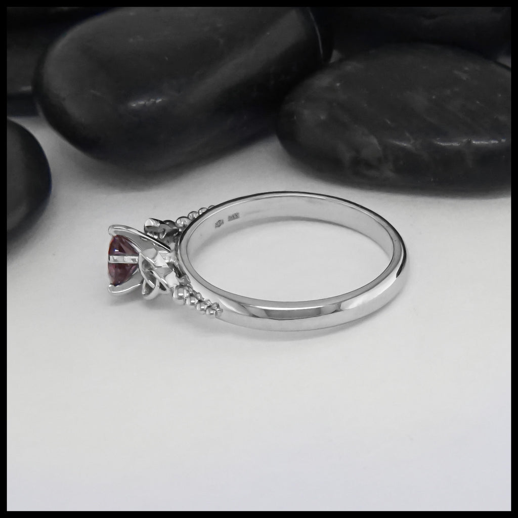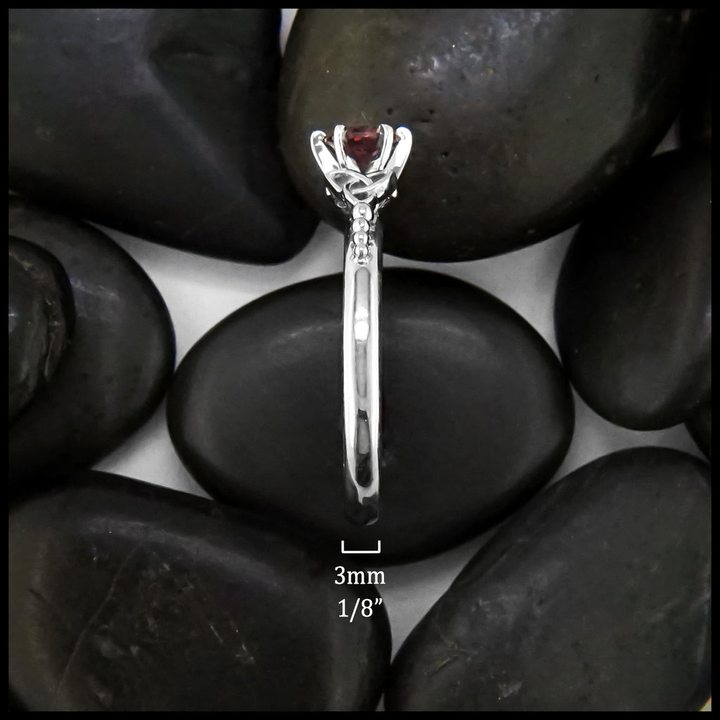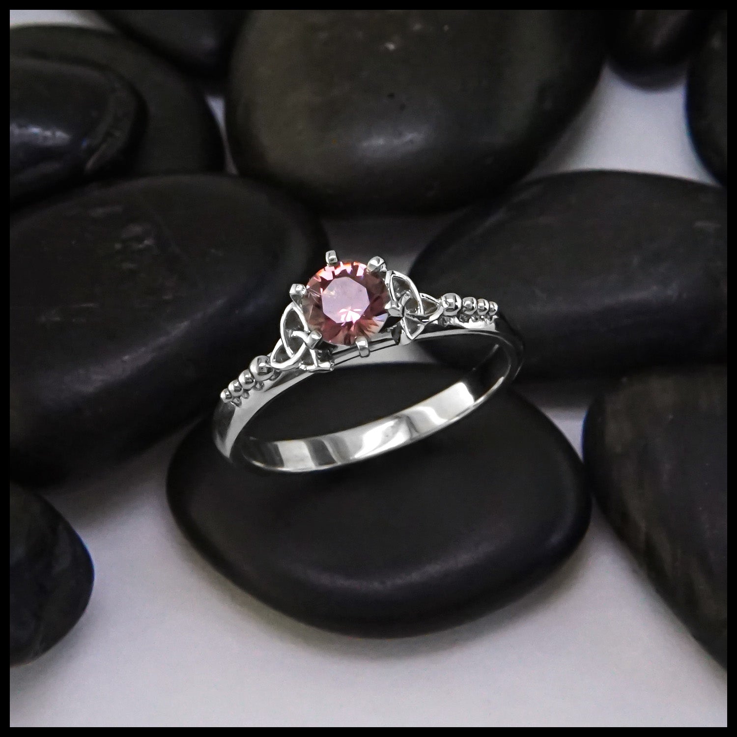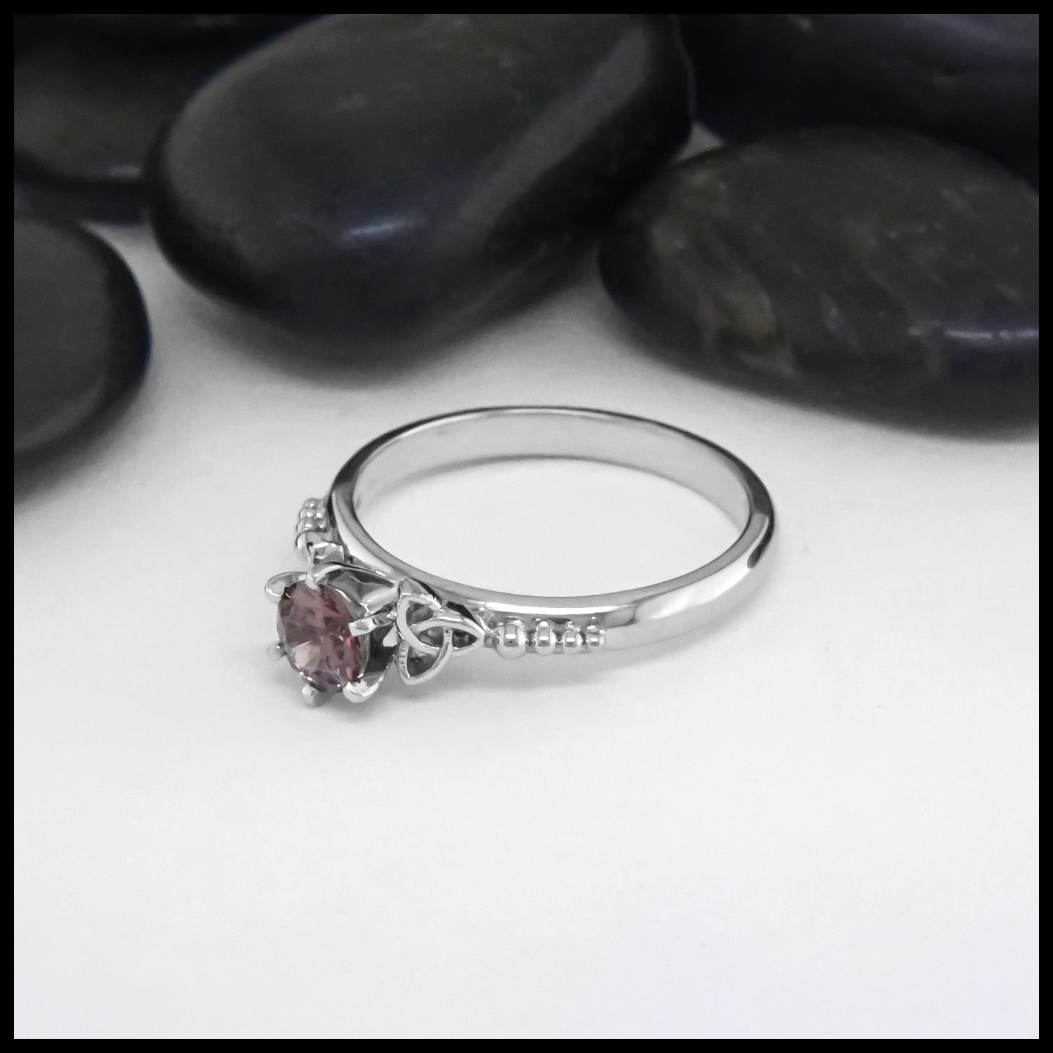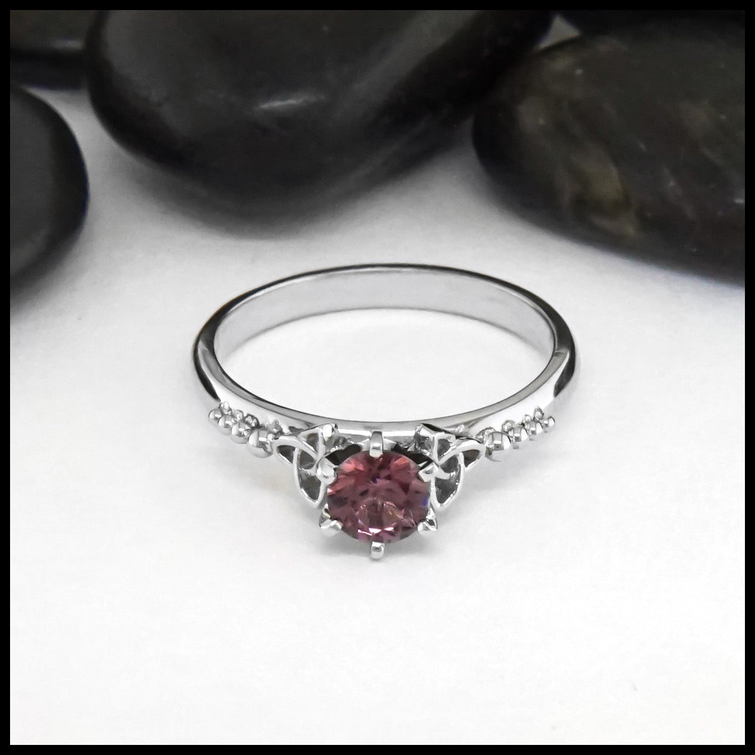 This beautiful 14K White Gold Trinity Knot Ring features Celtic trinities on both sides, with a 5mm Pink Spinel stone centerpiece. The elegant and timeless design details, accompanied by the pink gemstone, make this ring a perfect gift for special occasions. This ring is a size 7 1/2. Ring can be resized upon request.