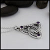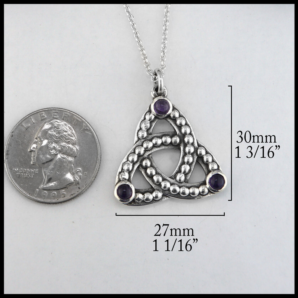 This updated Walker Metalsmiths design is Sterling Silver with three Amethyst beads set into a Trinity Knot. Silver beading detail surrounds the knot.