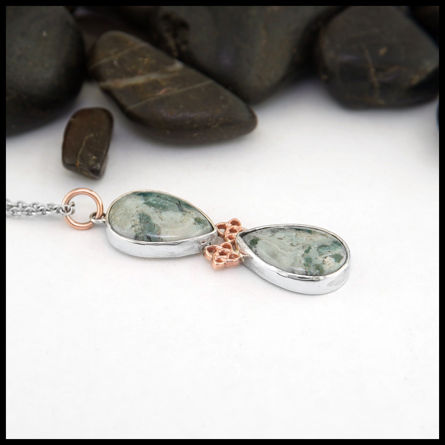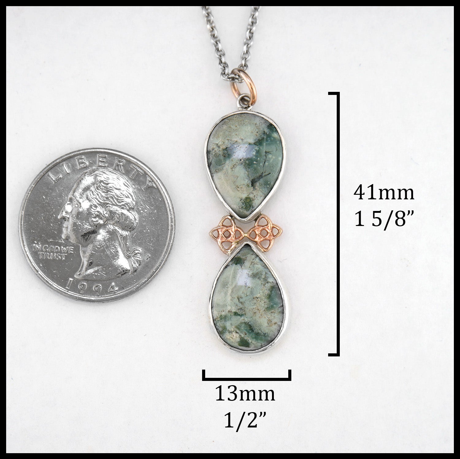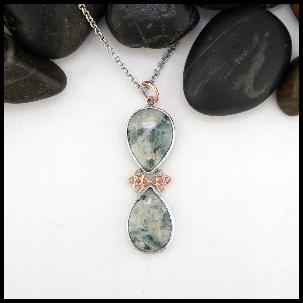 This custom pendant features two agate stones bezel set in sterling silver held together in the center by two starlight knots in 14K rose gold. The jump ring to this pendant is also 14K rose gold. The shape of these agates resembles that of an hour glass. This pendant comes with an attached 18" cable chain.