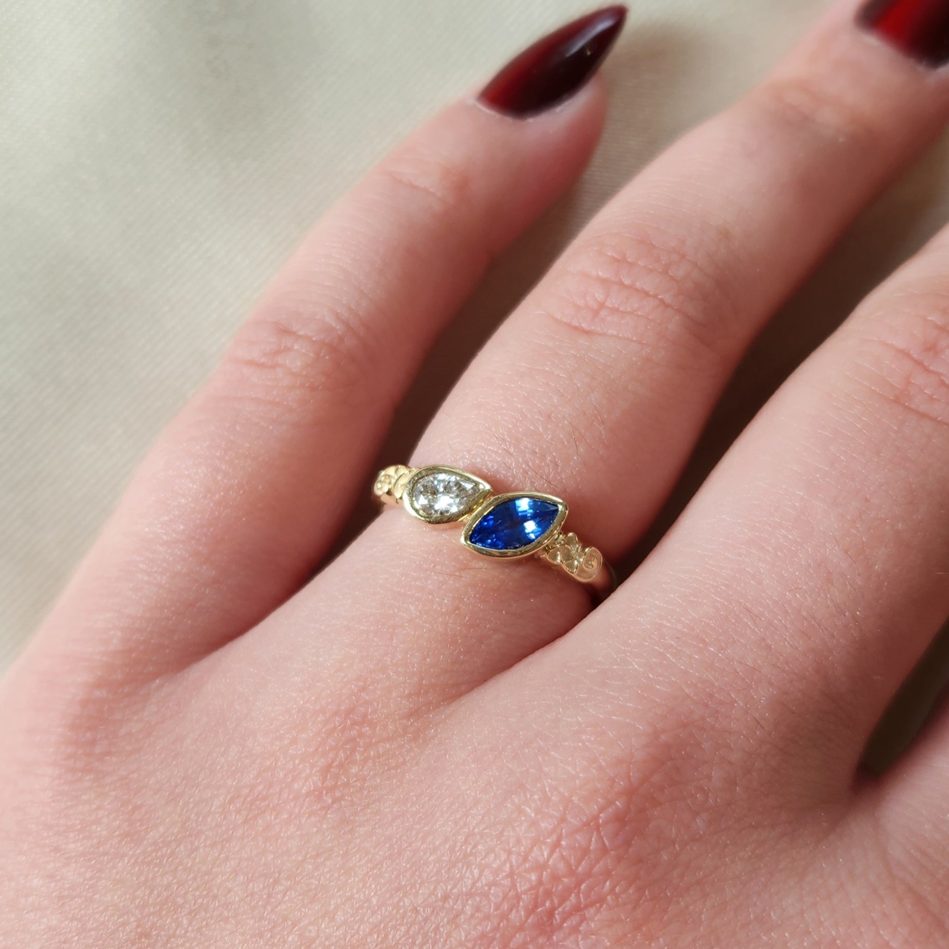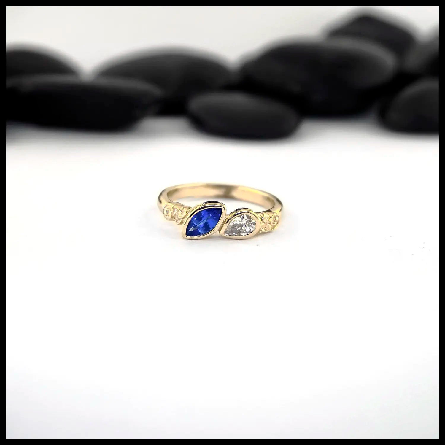 This gorgeous band featured a 1/4ct Pear Diamond, as well as a 7x4mm Marquise Blue Sapphire bezel set in 14K Yellow Gold. Accented by a Trinity Knot Celtic detailings, this ring is a size 7, and can be resized upon request. This ring was designed by our craftsman, Sydney!