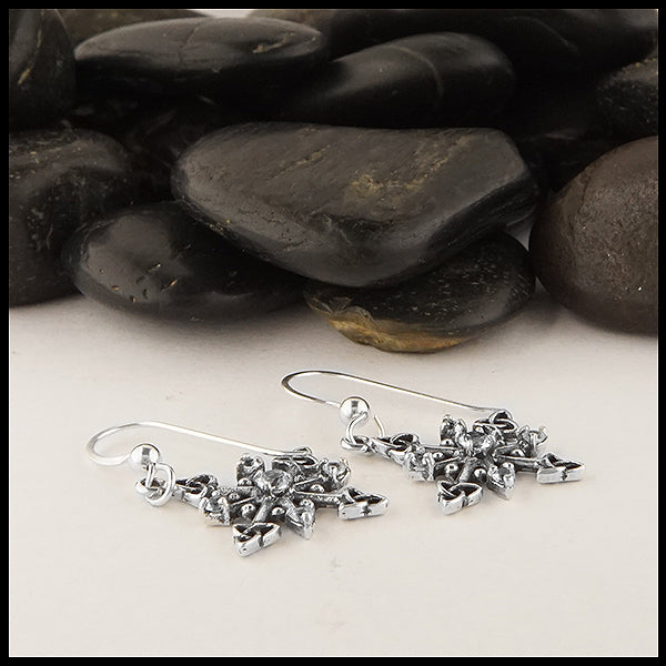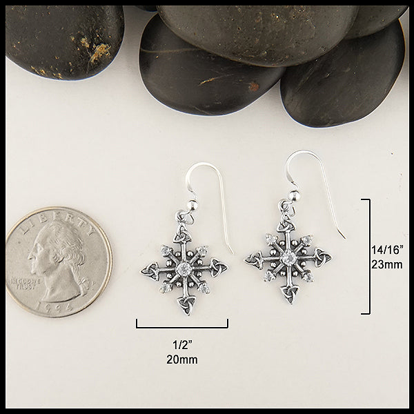 Sterling silver snowflake earrings with trinity knots on four points and detailed with 4 2mm and one center 3mm Sky Blue Topaz to create the perfect amount of snowflake sparkle. The stones are a light icy blue color!