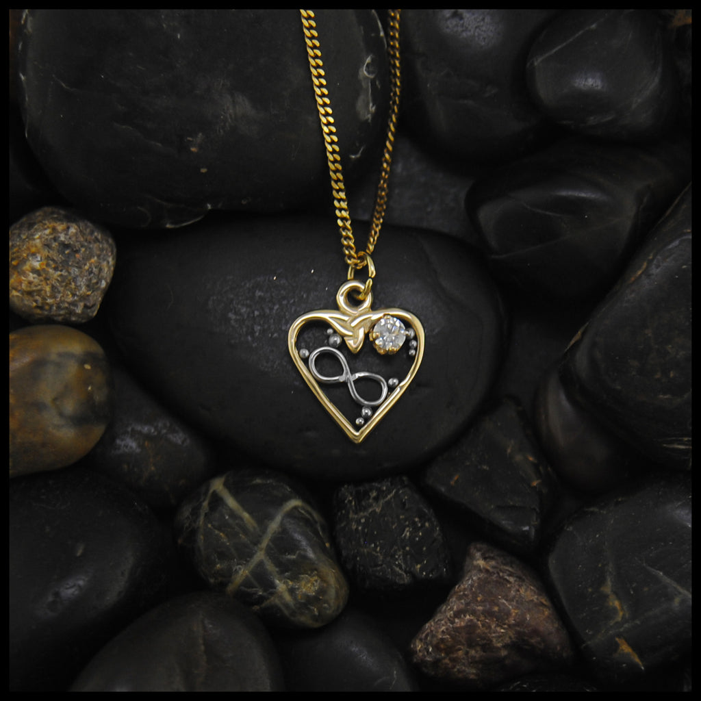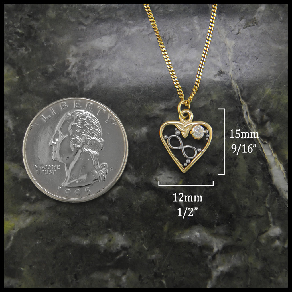 Open heart pendant in 14K yellow gold with 14K white gold beading and infinity wire detailing featuring a set diamond near the trinity knot at the top. This pendant is seen on an 18" fine Curb Chain.
