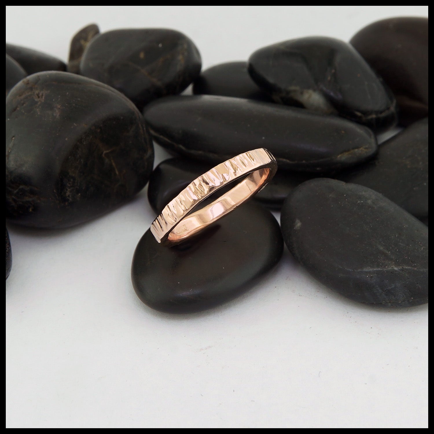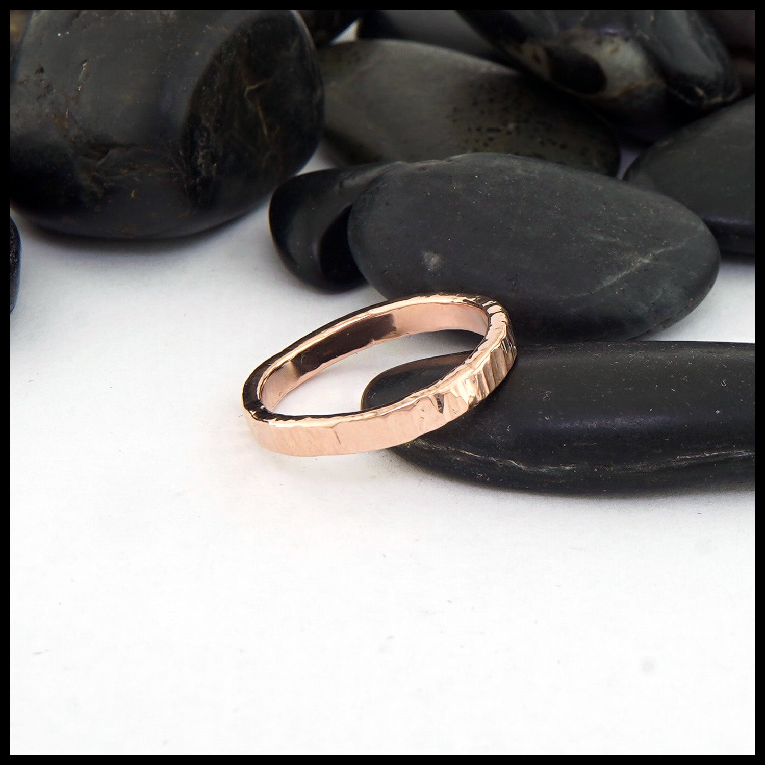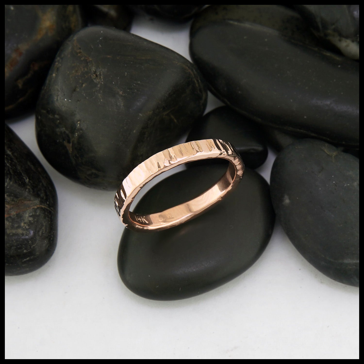 A simple 3mm band made in your choice of 14K yellow, white, or rose gold with a thin faceted hammered finish.