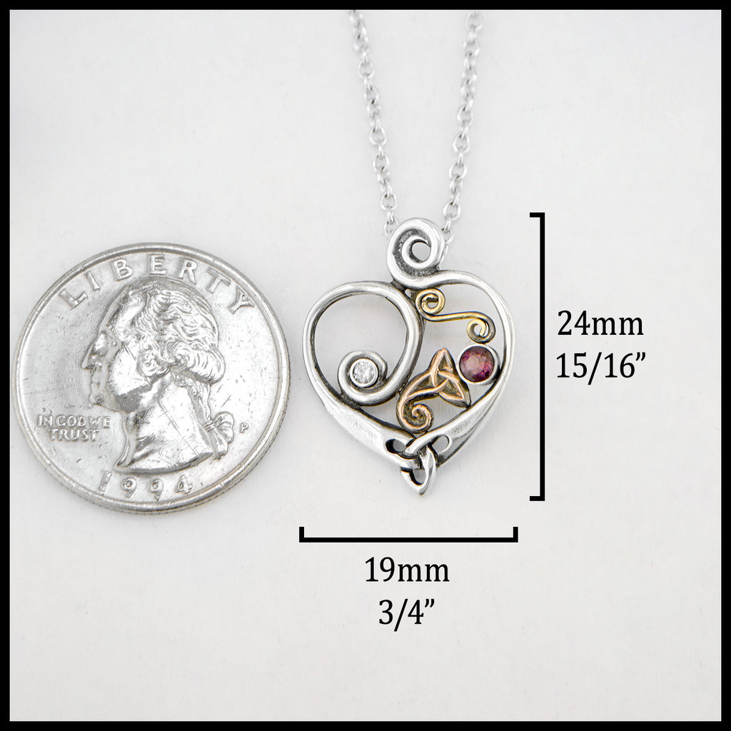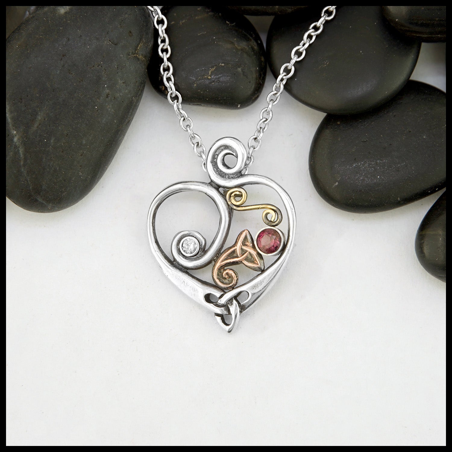 This custom pendant features a 2mm diamond and a 3mm pink tourmaline bezel set in a sterling silver frame. The pendant is decorated with a 14K rose gold trinity knot and beading,  as well as an 18K yellow gold spiral detail, a perfect gift for your valentine! This pendant comes with an 18" cable chain, and was created by our craftsman Johanna.