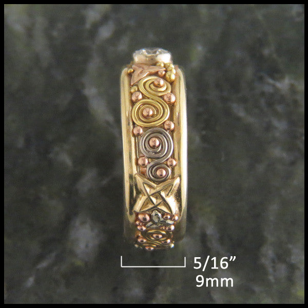 Unique custom band set with a center 0.42ct diamond. This band is filled with trinity knots and spirals. Available in a size 8.75.