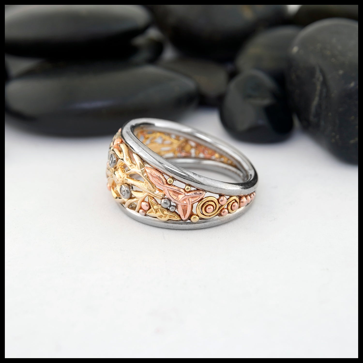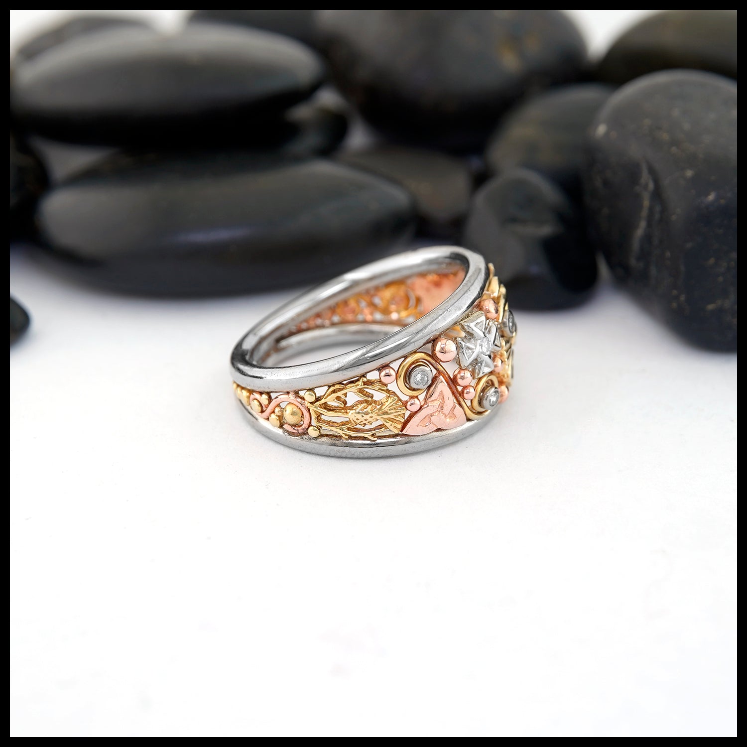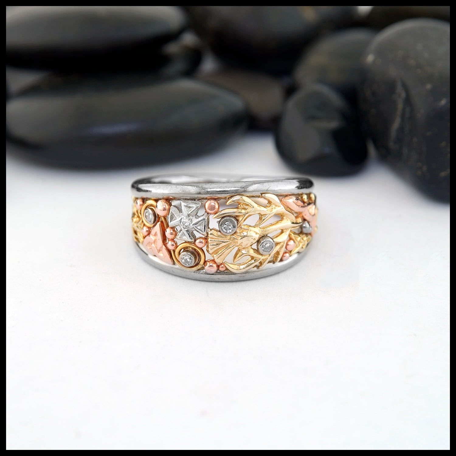 This custom ring features 14K white gold rails framing a decorative display of Celtic charm and 5 Diamonds. Within the frame are traditional Celtic symbols; crosses, trinities, and thistles. These symbols are accented by beading and wire detail all made from 14K gold in its various colors of; yellow, rose, and white. This ring is a size 8 and can be resized upon request.