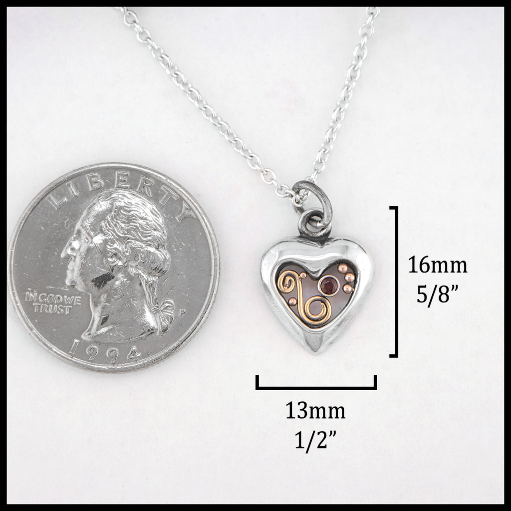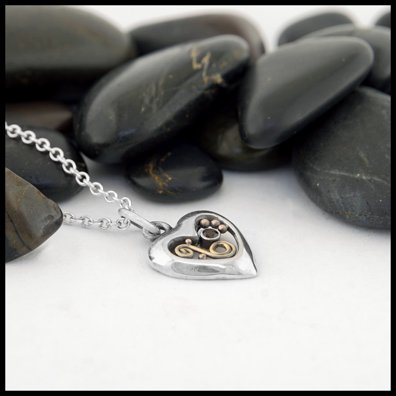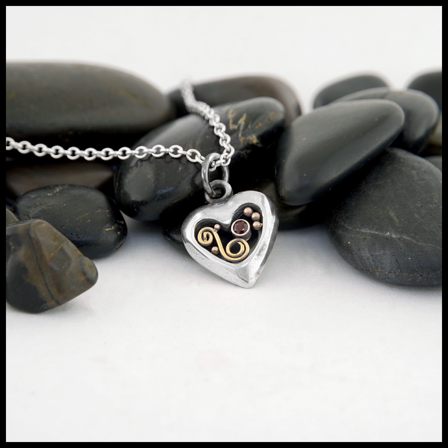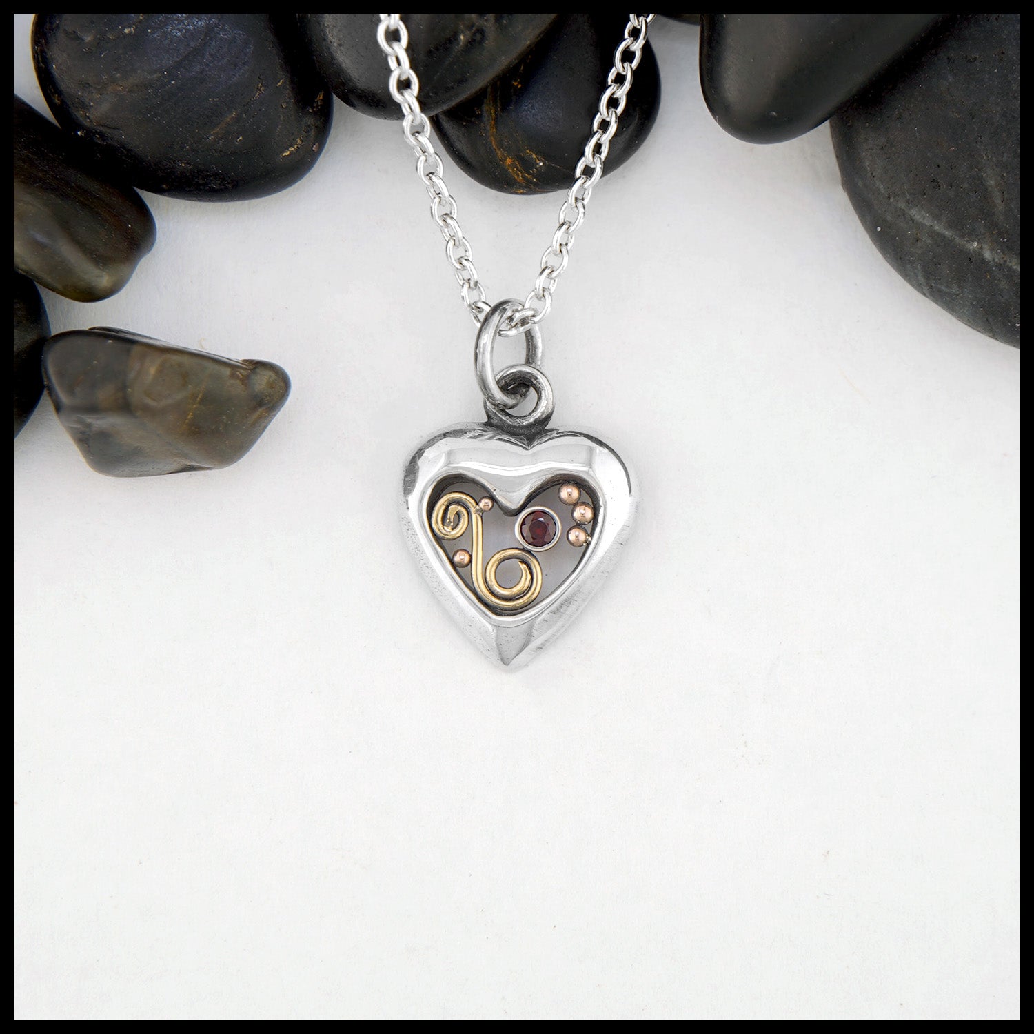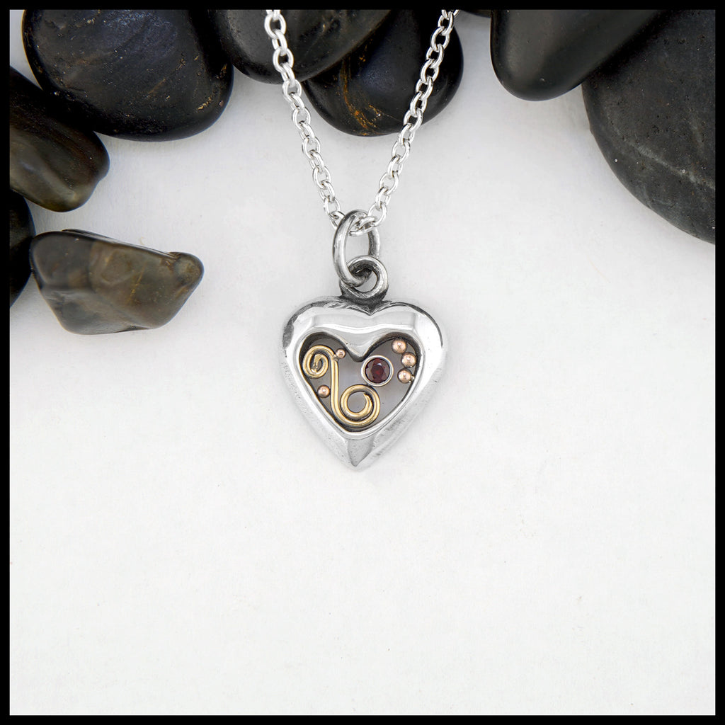 This custom pendant features a sterling silver heart with a 2mm bezel set garnet. Accenting this frame is an 18K yellow gold spiral, as well as 14K rose gold beading. This pendant comes with an 18" cable chain, and was created by our craftsman Johanna.