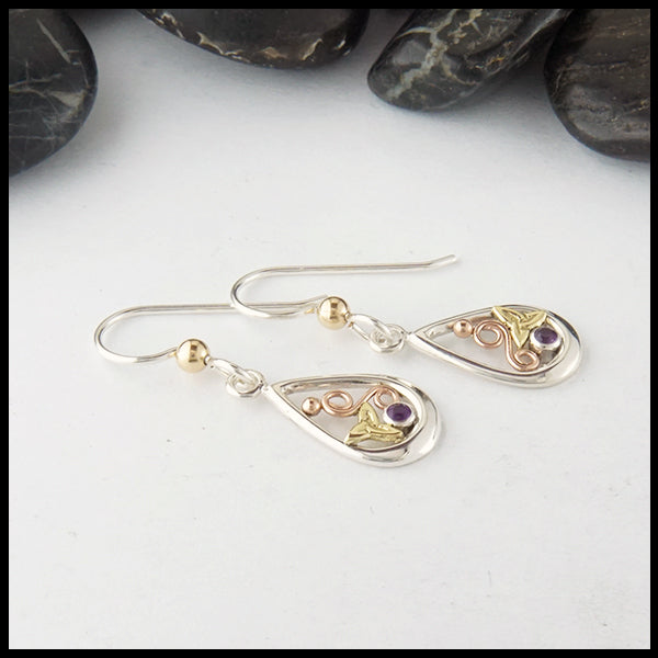 Teardrop earrings in Sterling Silver with 18K Yellow and 14K Rose Gold accents, each set with a 2mm Amethyst.