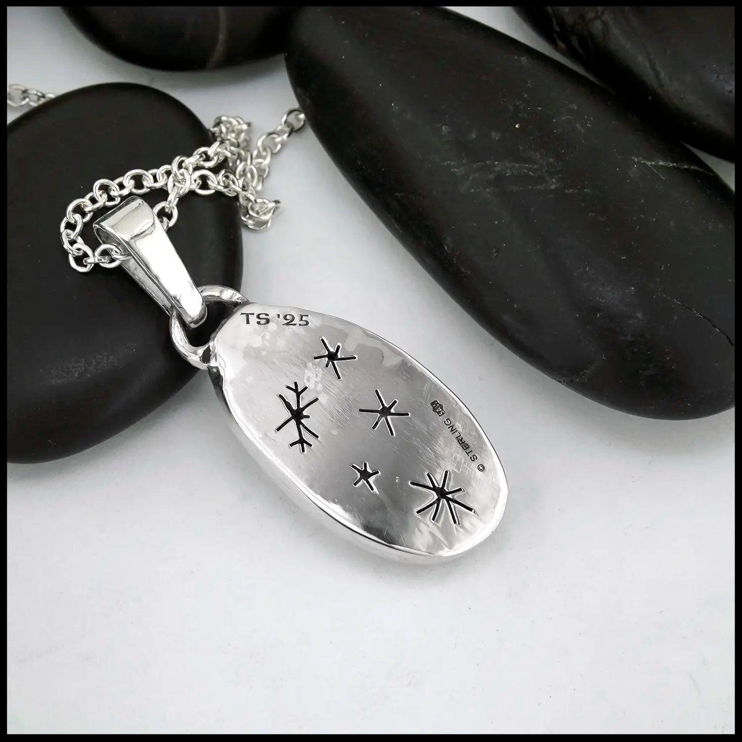 Set in a custom Sterling silver bezel, this stunning Dendritic Opal pendant holds a flurry of snowflakes on its' reverse! Created by our craftsman Terry, this pendant comes on an 18" Cable Chain.