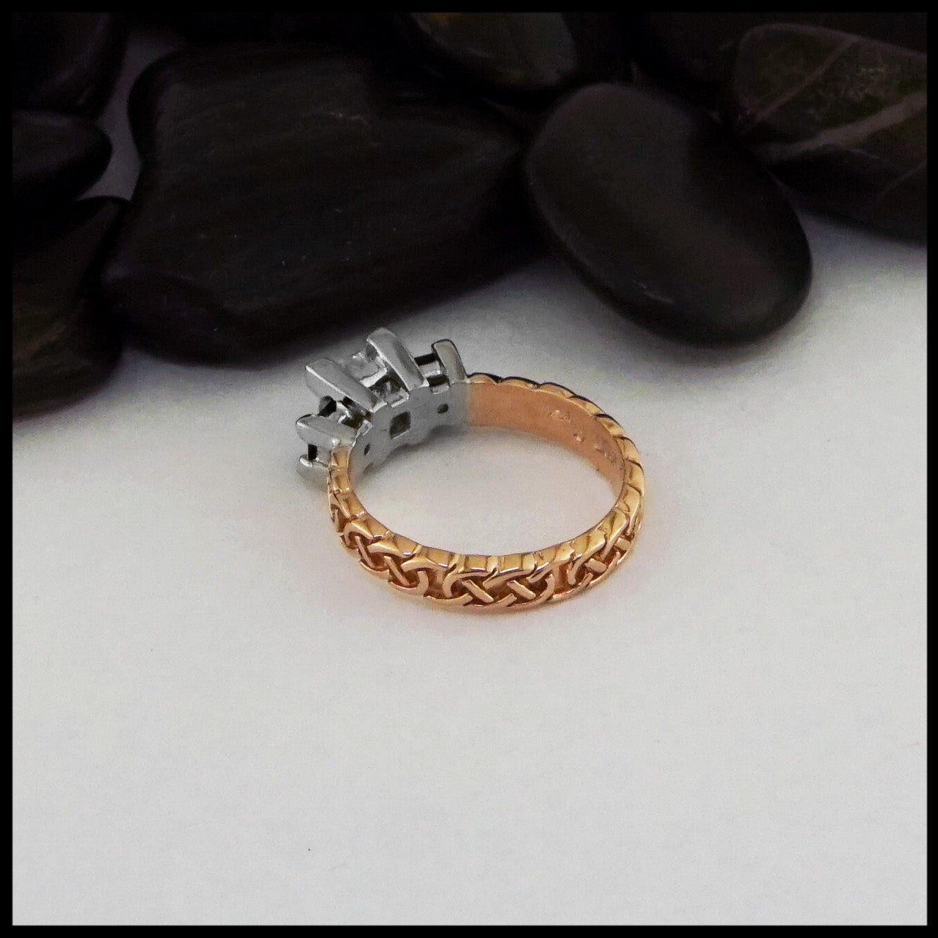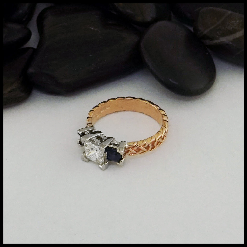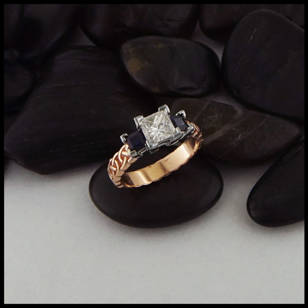 This elegant custom ring has Josephine's Knot detailing on the band in 14K Rose Gold and is set with a GIA certified modified .99CT Princess Diamond and two 3.3x3.3mm reclaimed Sapphires. This ring is a size 7 and it can not be resized.
